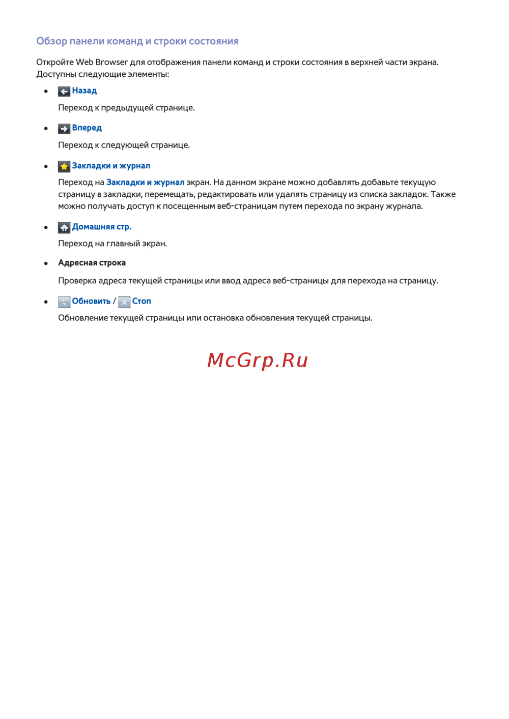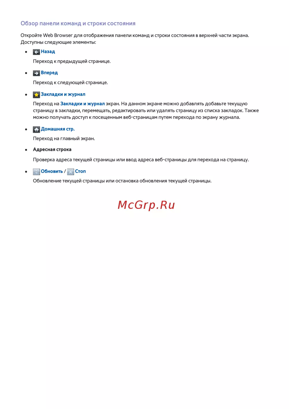 Откройте Web Browser для отображения панели команд и строки состояния в верхней части экрана.