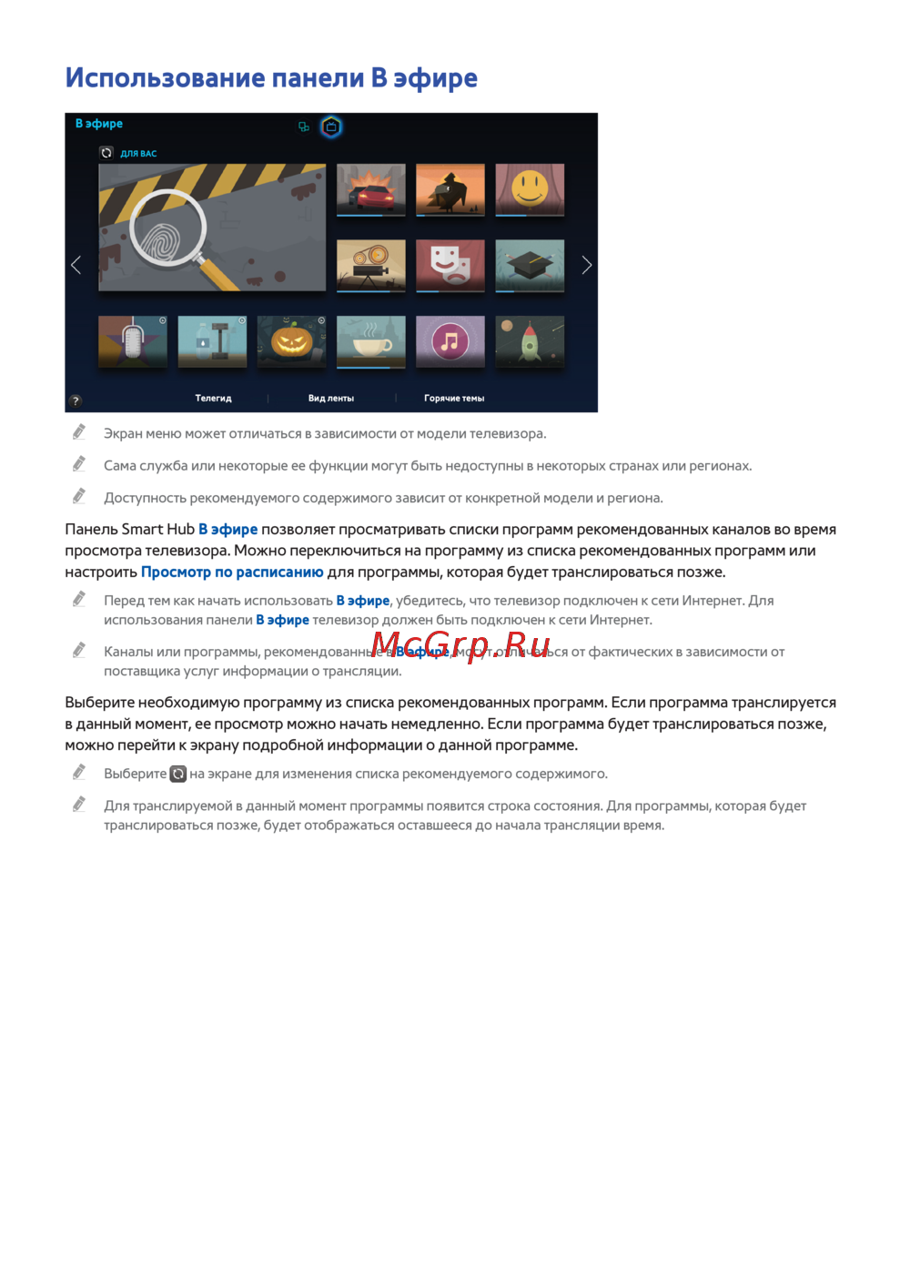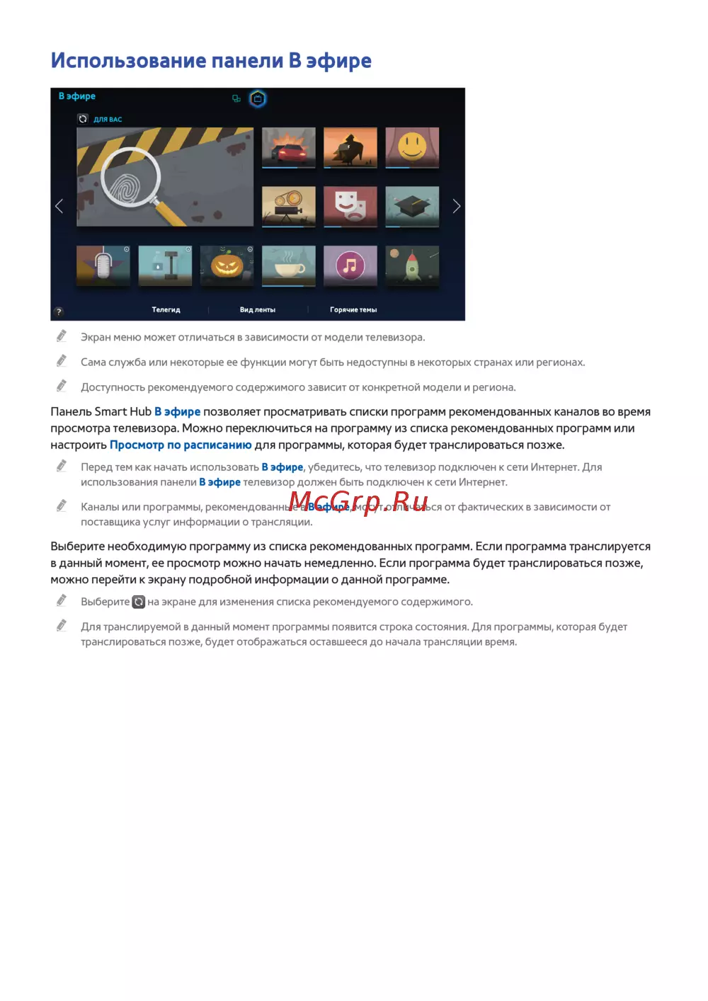 использования панели В эфире телевизор должен быть подключен к сети Интернет.