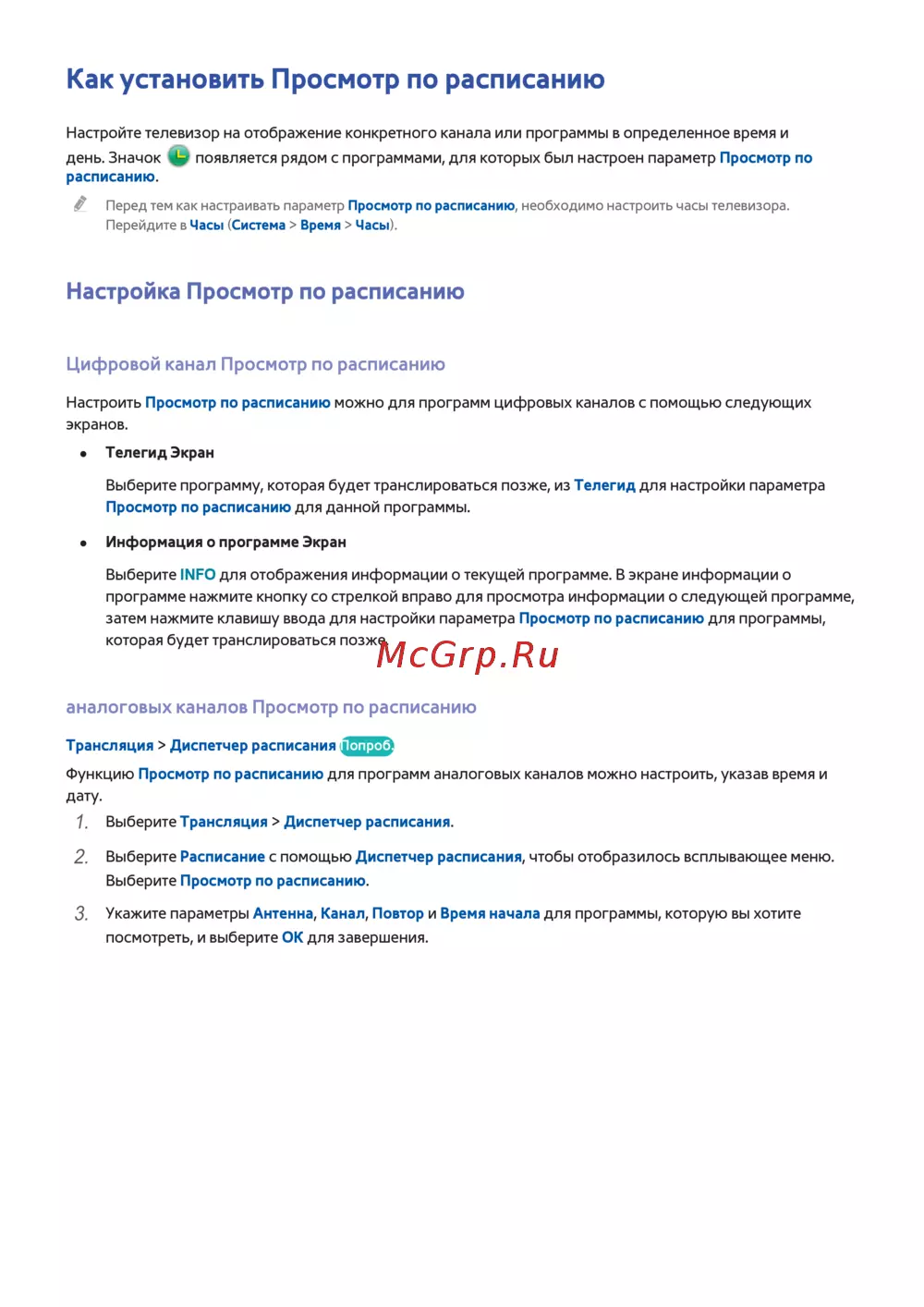 Перед тем как настраивать параметр Просмотр по расписанию, необходимо настроить часы телевизора.