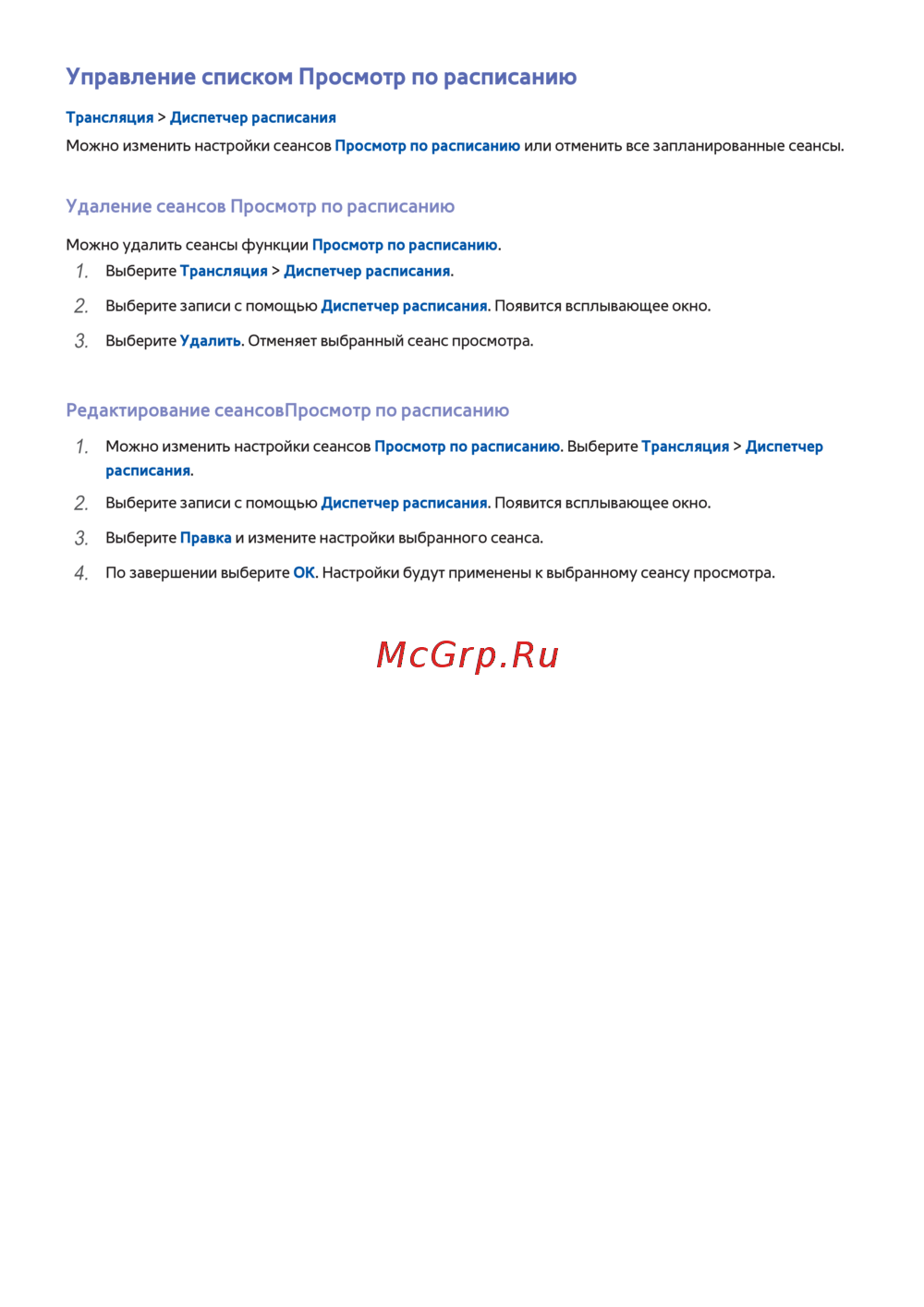 Можно изменить настройки сеансов Просмотр по расписанию. Выберите Трансляция > Диспетчер