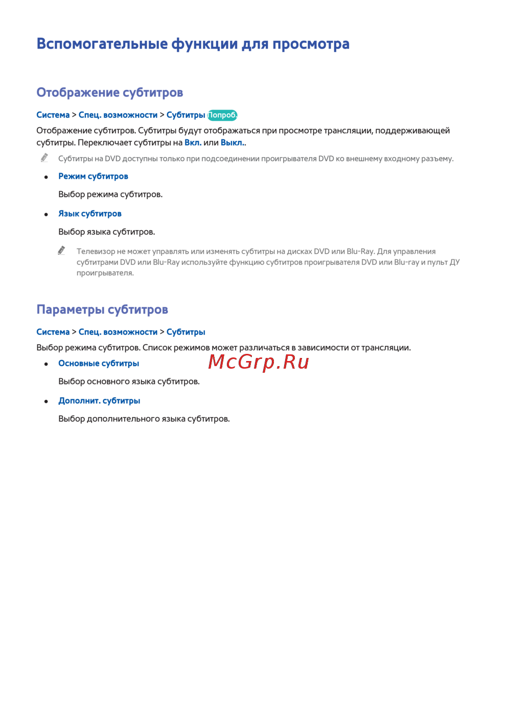 Телевизор не может управлять или изменять субтитры на дисках DVD или Blu-Ray. Для управления
