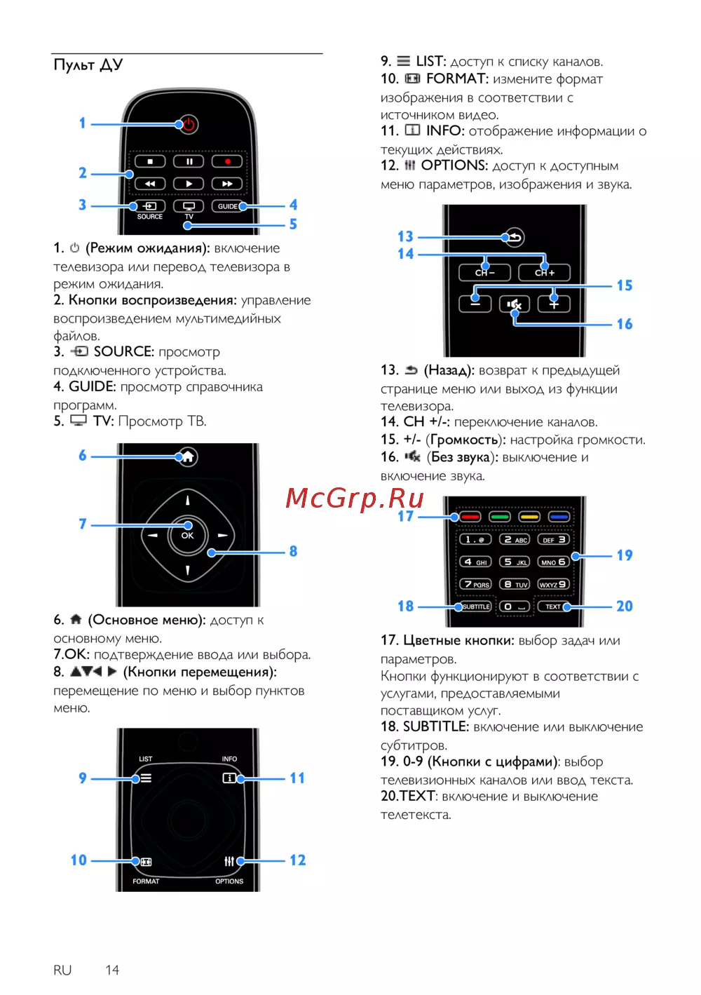 14. CH +/-: переключение каналов.