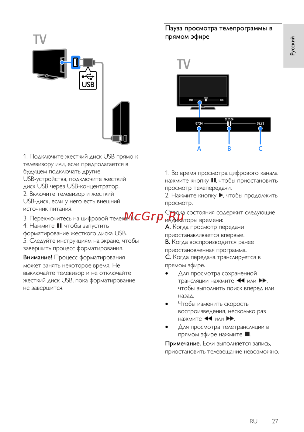 Philips 40PFL4358H [27/77] Пауза просмотра телепрограммы в прямом эфире