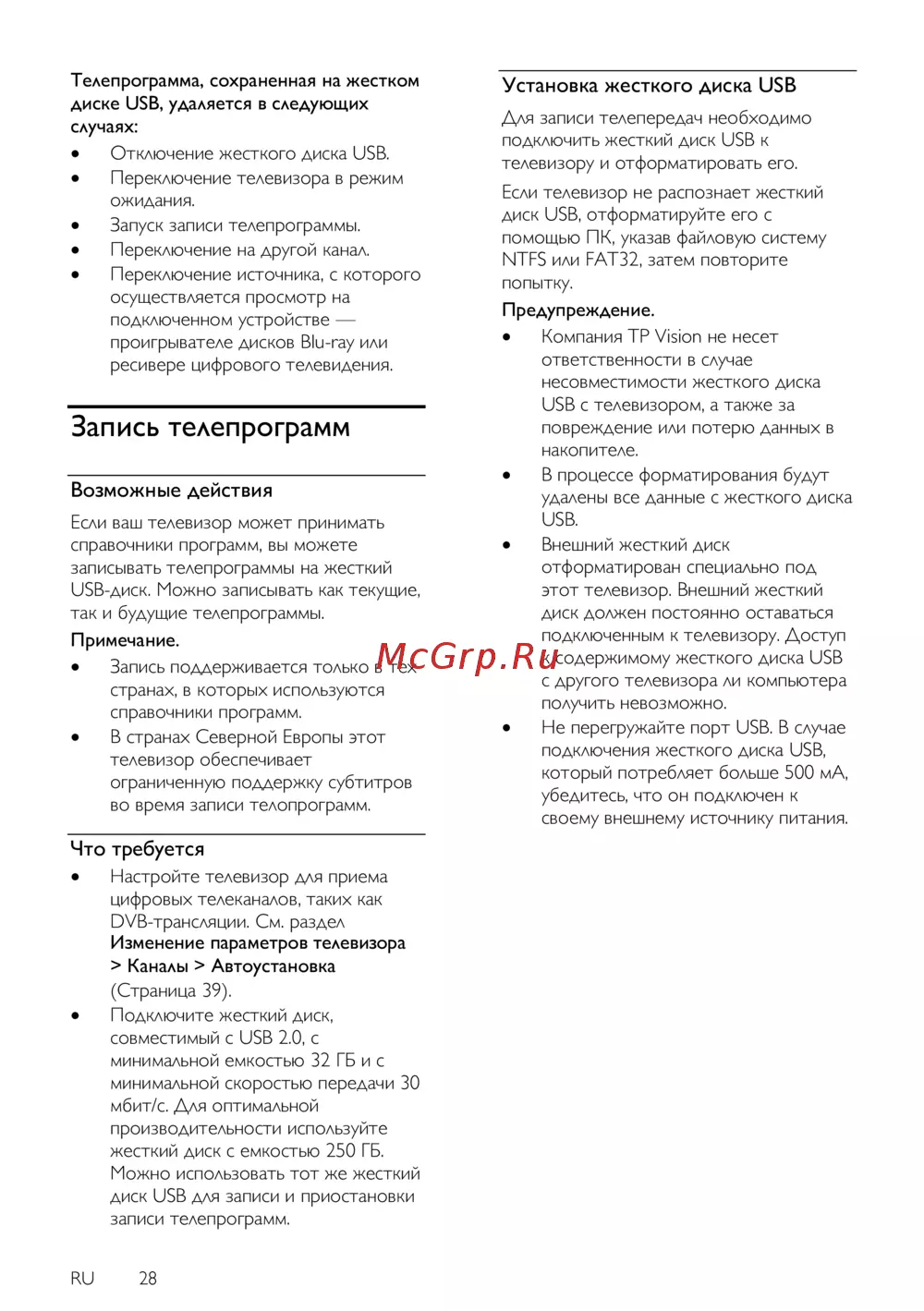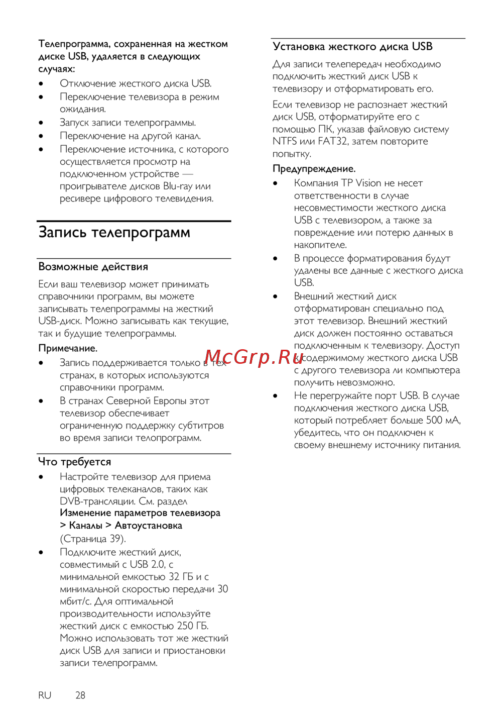 Philips 40PFL4358H — как записывать телепрограммы на USB-диск в телевизоре: инструкция и требования [28/77]