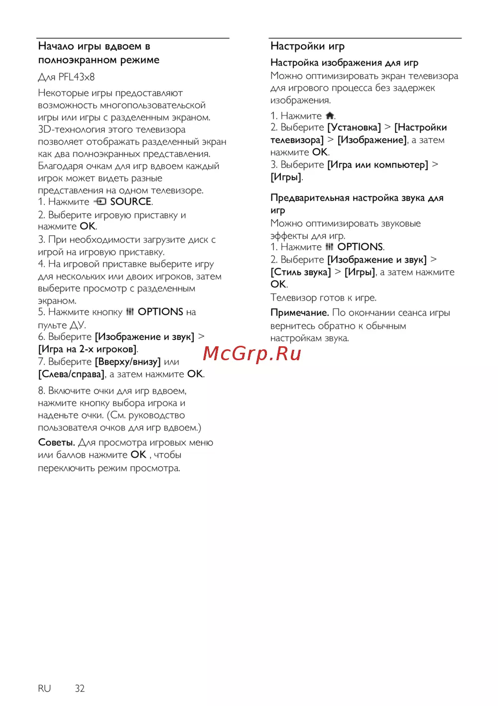 Philips 40PFL4358H [32/77] Начало игры вдвоем в полноэкранном режиме