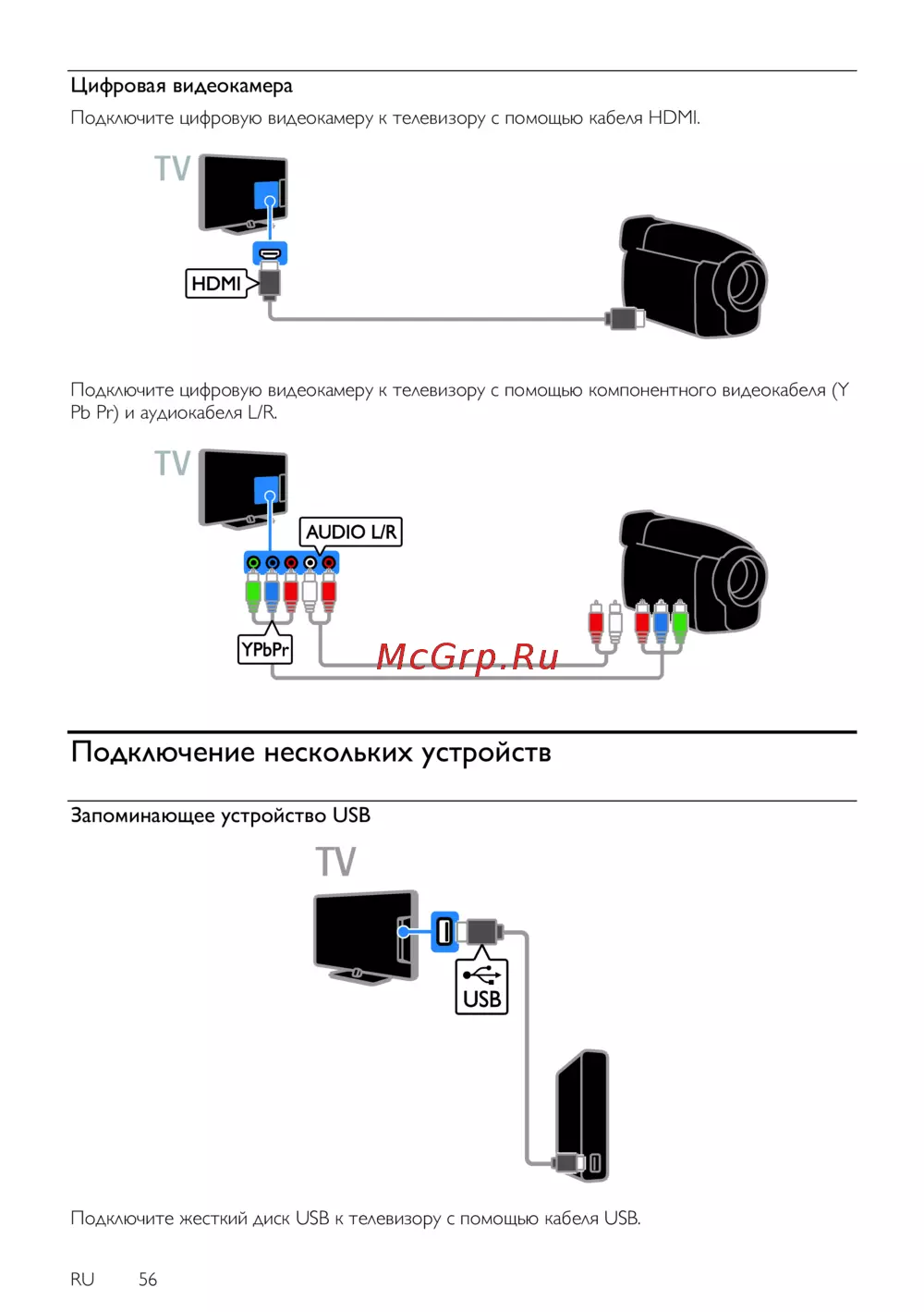 - Подключите флэш накопитель usb к телевизору с помощью кабеля usb p.57