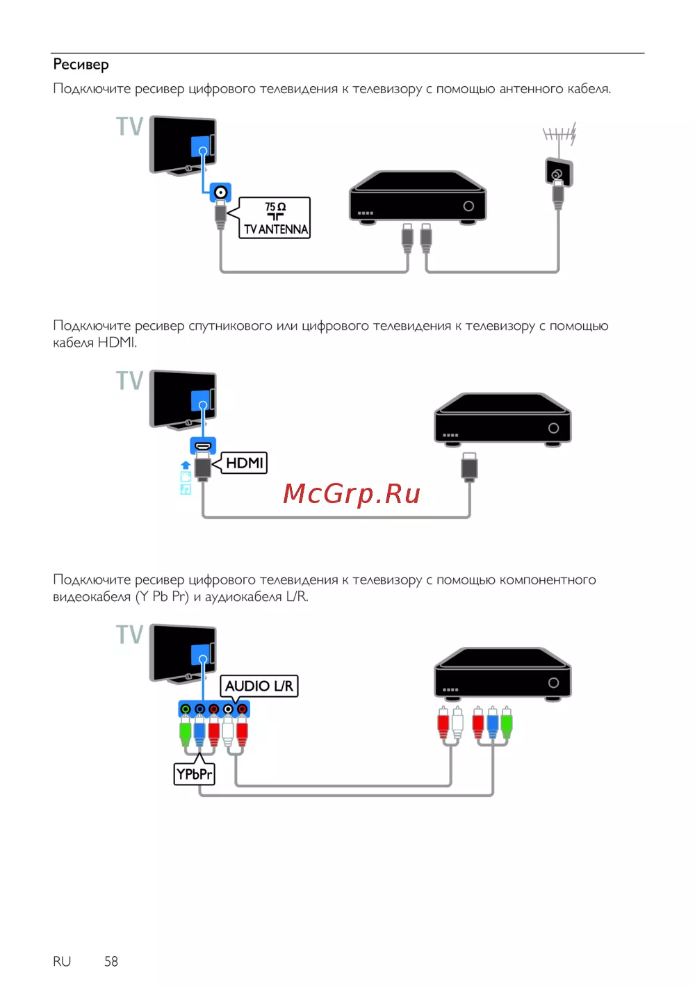 Подключите ресивер цифрового телевидения к телевизору с помощью компонентного