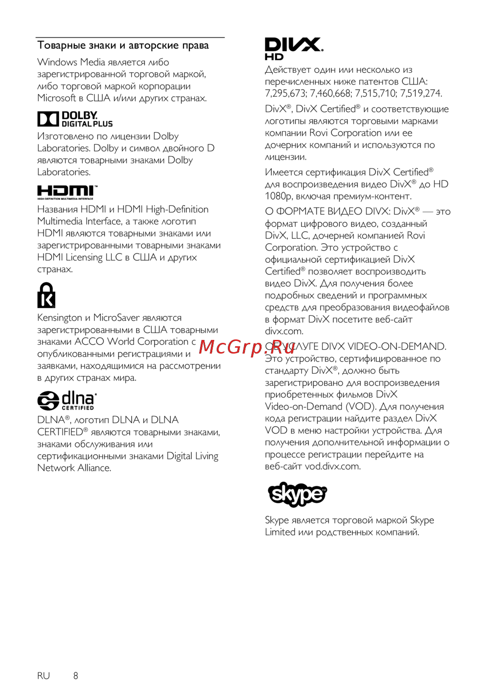 ![Philips 40PFL3208H [8/91] Товарные знаки и авторские права](/views2/1023923/page8/bg8.png)