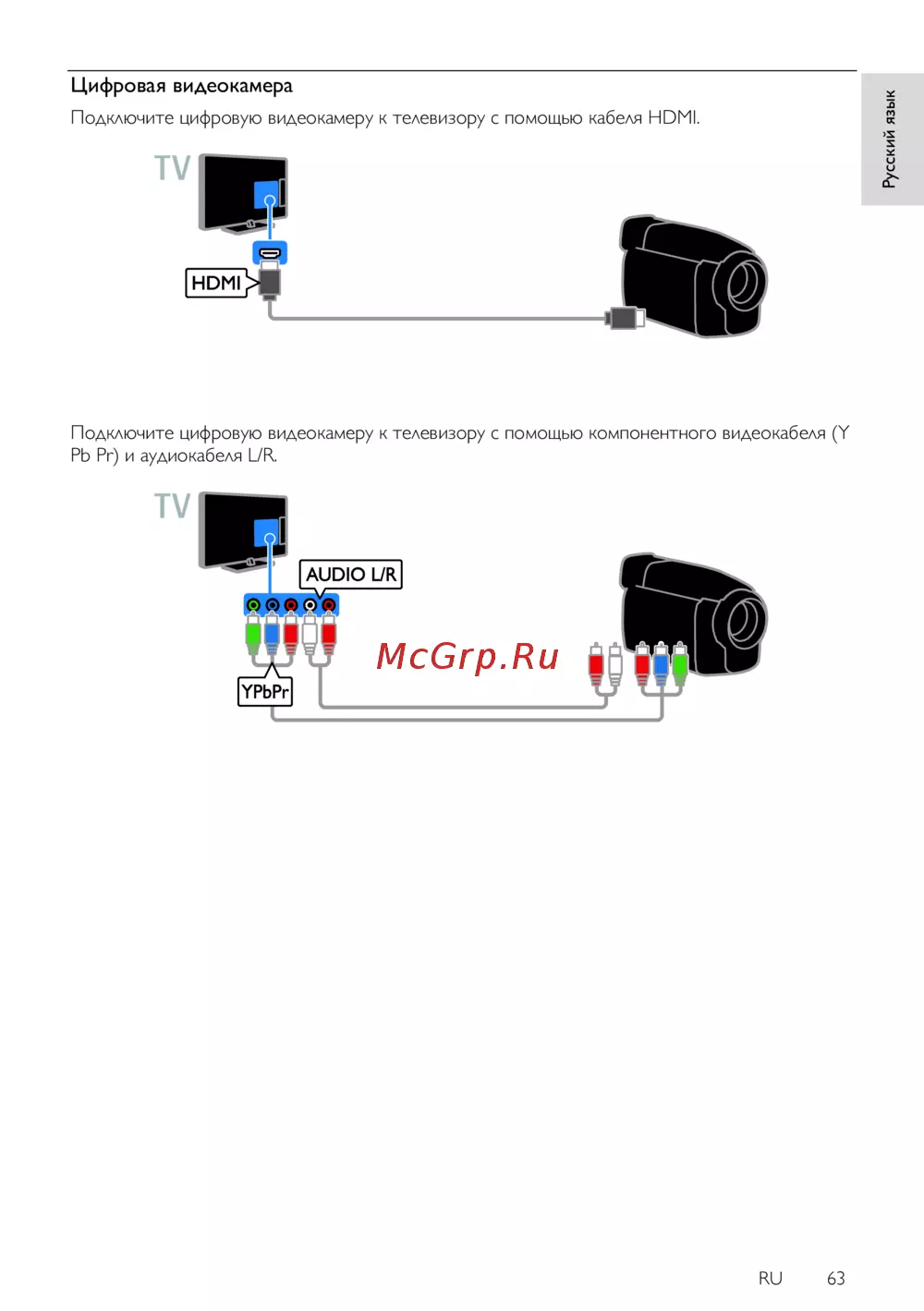 - Подключите цифровую видеокамеру к телевизору с помощью компонентного видеокабеля y подключите цифровую видеокамеру к телевизору с помощью компонентного видеокабеля y pb pr и аудиокабеля l r p.63