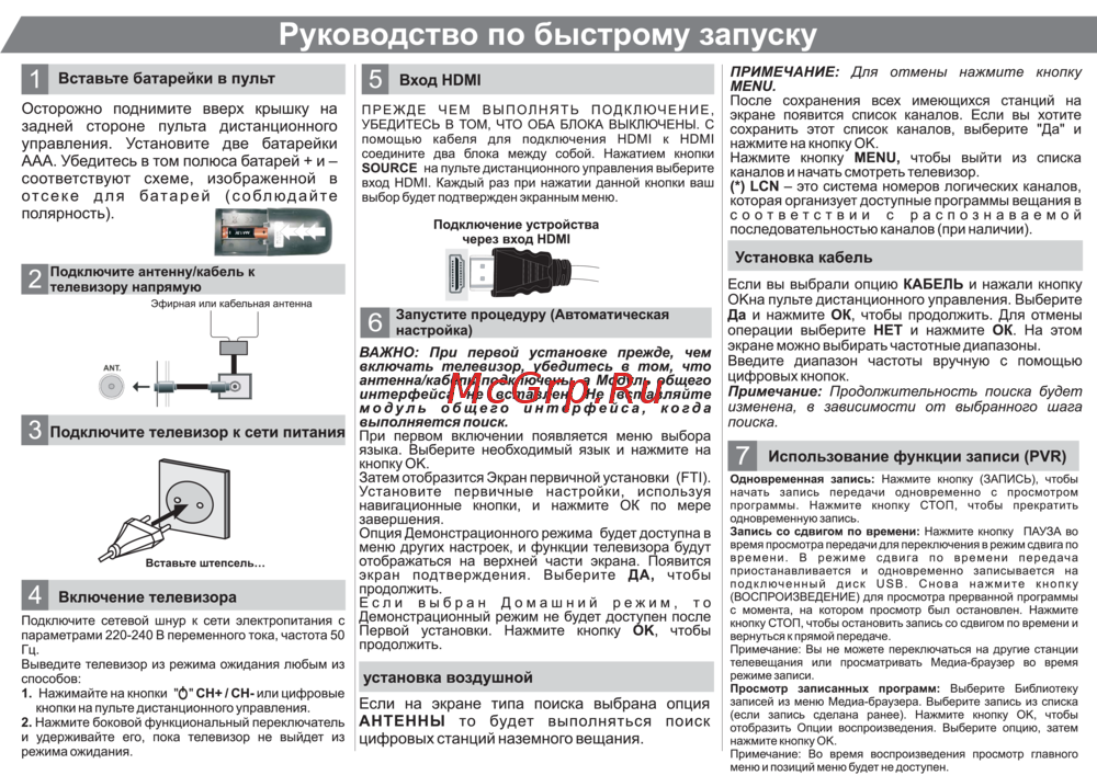 Руководство по быстрому запуску Вставьте батарейки в пульт Осторожно поднимите вверх крышку на задней стороне пульта дистанционного управления Установите две батарейки ААА Убедитесь в том полюса батарей и соответствуют схеме изображенной в отсеке для батарей соблюдайте полярность 5 Вход HDMI ПРЕЖДЕ ЧЕМ ВЫПОЛНЯТЬ ПОДКЛЮЧЕНИЕ УБЕДИТЕСЬ В ТОМ ЧТО ОБА БЛОКА ВЫКЛЮЧЕНЫ С помощью кабеля для подключения HDMI к HDMI соедините два блока между собой Нажатием кнопки SOURCE на пульте дистанционного управления выберите вход HDMI Каждый раз при нажатии данной кнопки ваш выбор будет подтвержден экранным меню Подключение устройства через вход HDMI ПРИМЕЧАНИЕ Для отмены нажмите кнопку MENU После сохранения всех имеющихся станций на экране появится список каналов Если вы хотите сохранить этот список каналов выберите Да и нажмите на кнопку ОК Нажмите кнопку MENU чтобы выйти из списка каналов и начать смотреть телевизор LCN это система номеров логических каналов которая организует доступные программы вещания в соответствии с распознаваемой последовательностью каналов при наличии Установка кабель Подключите антенну кабель к телевизору напрямую антенна Запустите процедуру Автоматическая настройка Подключите телевизор к сети питани Включение телевизора Подключите сетевой шнур к сети электропитания с параметрами 220 240 В переменного тока частота 50 Гц Выведите телевизор из режима ожидания любым из способов 1 Нажимайте на кнопки б СН СН или цифровые кнопки на пульте дистанционного управления 2 Нажмите боковой функциональный переключатель и удерживайте его пока телевизор не выйдет из режима ожидания ВАЖНО При первой установке прежде чем включать телевизор убедитесь в том что антенна кабель подключены а Модуль общего интерфейса не вставлен Не вставляйте модуль общего интерфейса когда выполняется поиск При первом включении появляется меню выбора языка Выберите необходимый язык и нажмите на кнопку ОК Затем отобразится Экран первичной установки РТ1 Установите первичные настройки используя навигационные кнопки и нажмите ОК по мере завершения Опция Демонстрационного режима будет доступна в меню других настроек и функции телевизора будут отображаться на верхней части экрана Появится экран подтверждения Выберите ДА чтобы продолжить Если выбран Домашний режим то Демонстрационный режим не будет доступен после Первой установки Нажмите кнопку ОК чтобы продолжить установка воздушной Если на экране типа поиска выбрана опция АНТЕННЫ то будет выполняться поиск цифровых станций наземного вещания Если вы выбрали опцию КАБЕЛЬ и нажали кнопку ОКна пульте дистанционного управления Выберите Да и нажмите ОК чтобы продолжить Для отмены операции выберите НЕТ и нажмите ОК На этом экране можно выбирать частотные диапазоны Введите диапазон частоты вручную с помощью цифровых кнопок Примечание Продолжительность поиска будет изменена в зависимости от выбранного шага поиска Использование функции записи PVR Одновременная запись Нажмите кнопку ЗАПИСЬ чтобы начать запись передачи одновременно с просмотром программы Нажмите кнопку СТОП чтобы прекратить одновременную запись Запись со сдвигом по времени Нажмите кнопку ПАУЗА во время просмотра передачи для переключения в режим сдвига по времени В режиме сдвига по времени передача приостанавливается и одновр