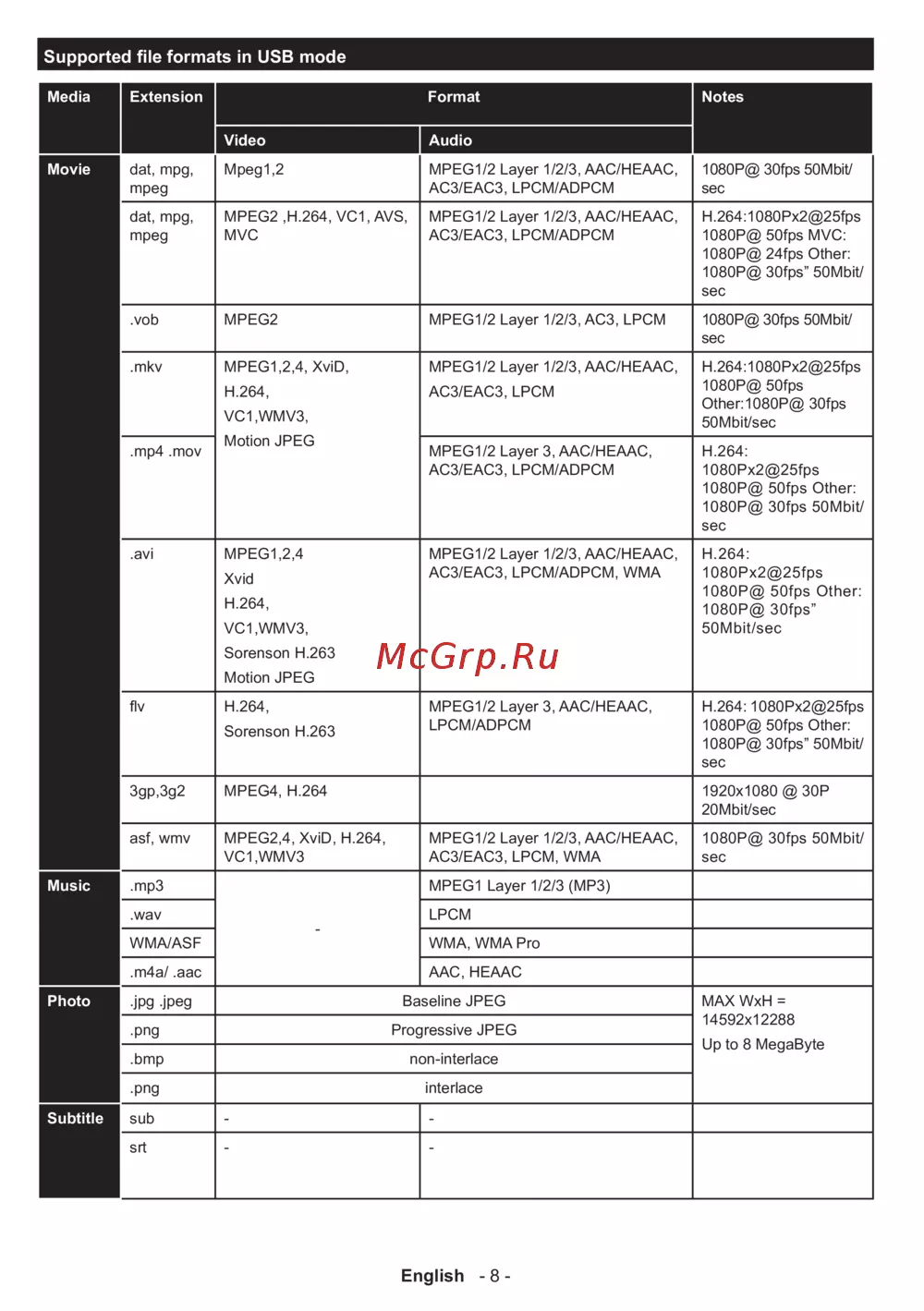 Philips 32PFL3008K [9/10] Supported file formats in usb mode