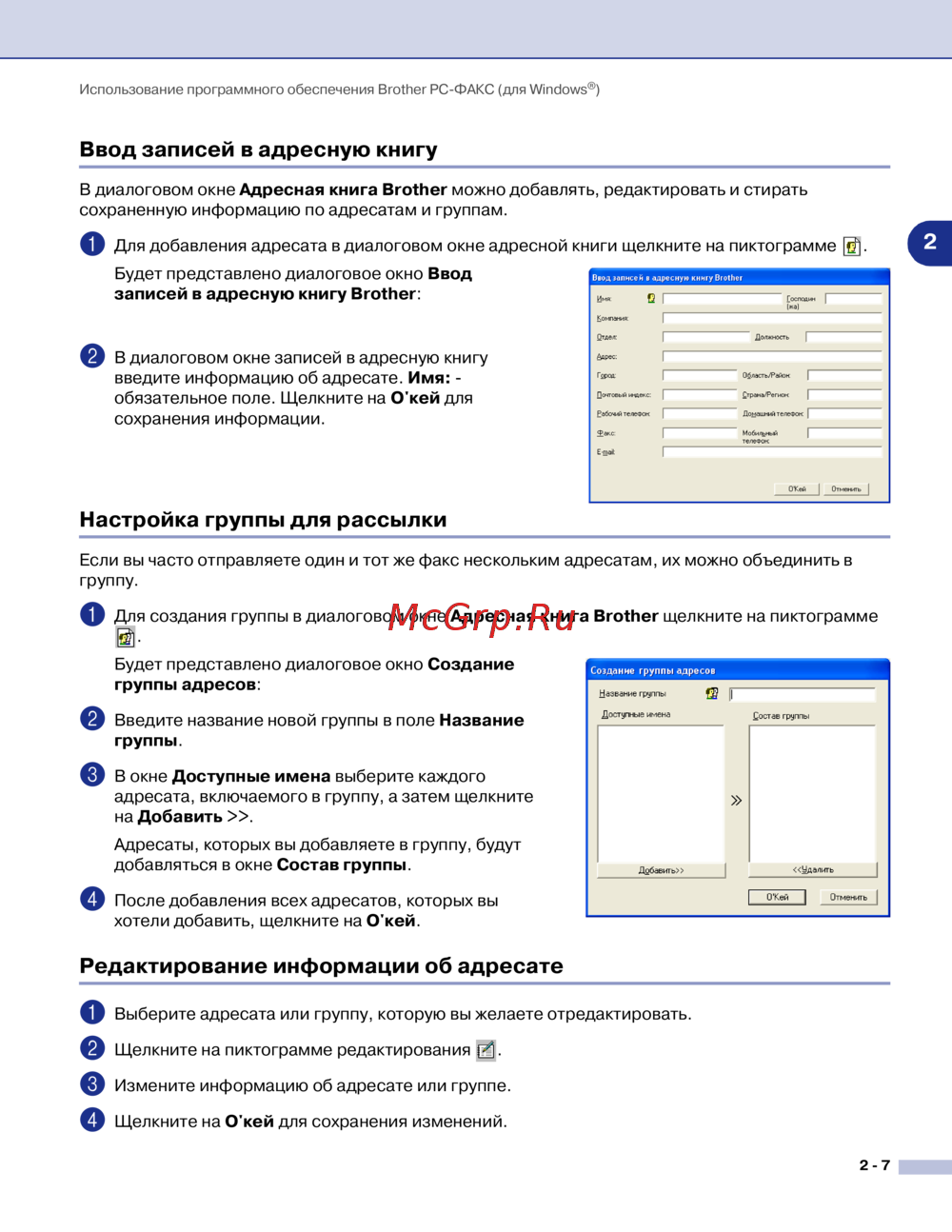 В диалоговом окне Адресная книга Brother можно добавлять, редактировать и стирать