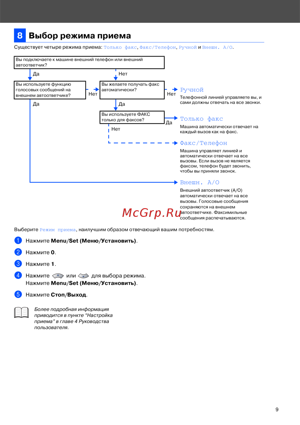 Существует четыре режима приема: Только факс, Факс/Телефон, Ручной и Внешн. А/О.