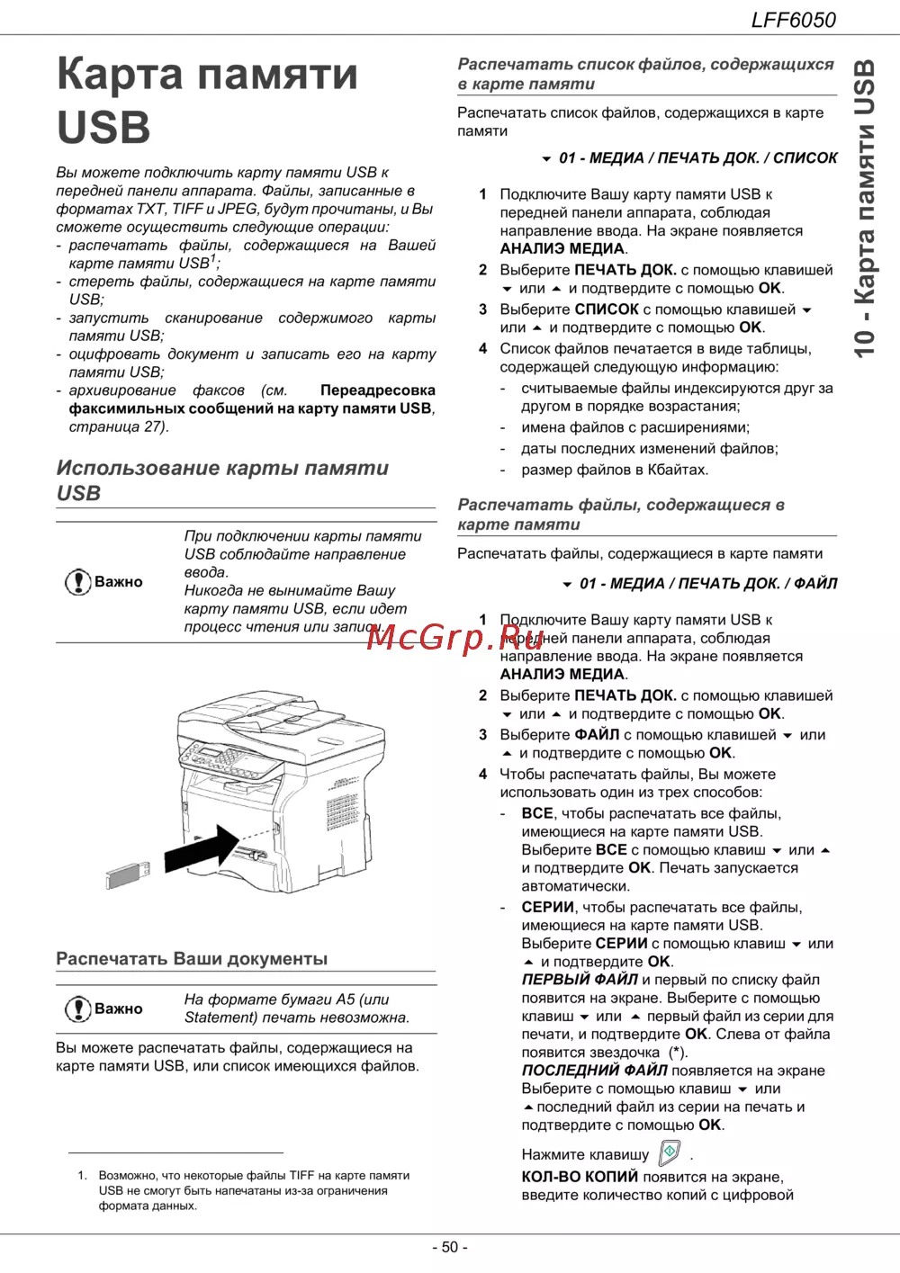 Узнайте, как подключить карту памяти USB для печати документов и управления файлами. Операции включают печать, удаление и архивирование факсов.