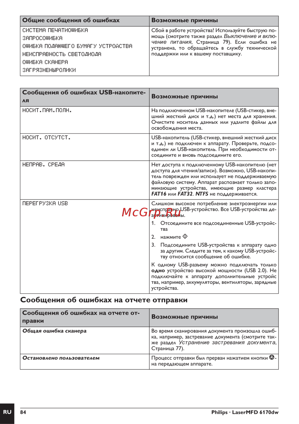 Philips LaserMFD 6170dw — сообщения об ошибках и их устранение для печатающих устройств [84/96]