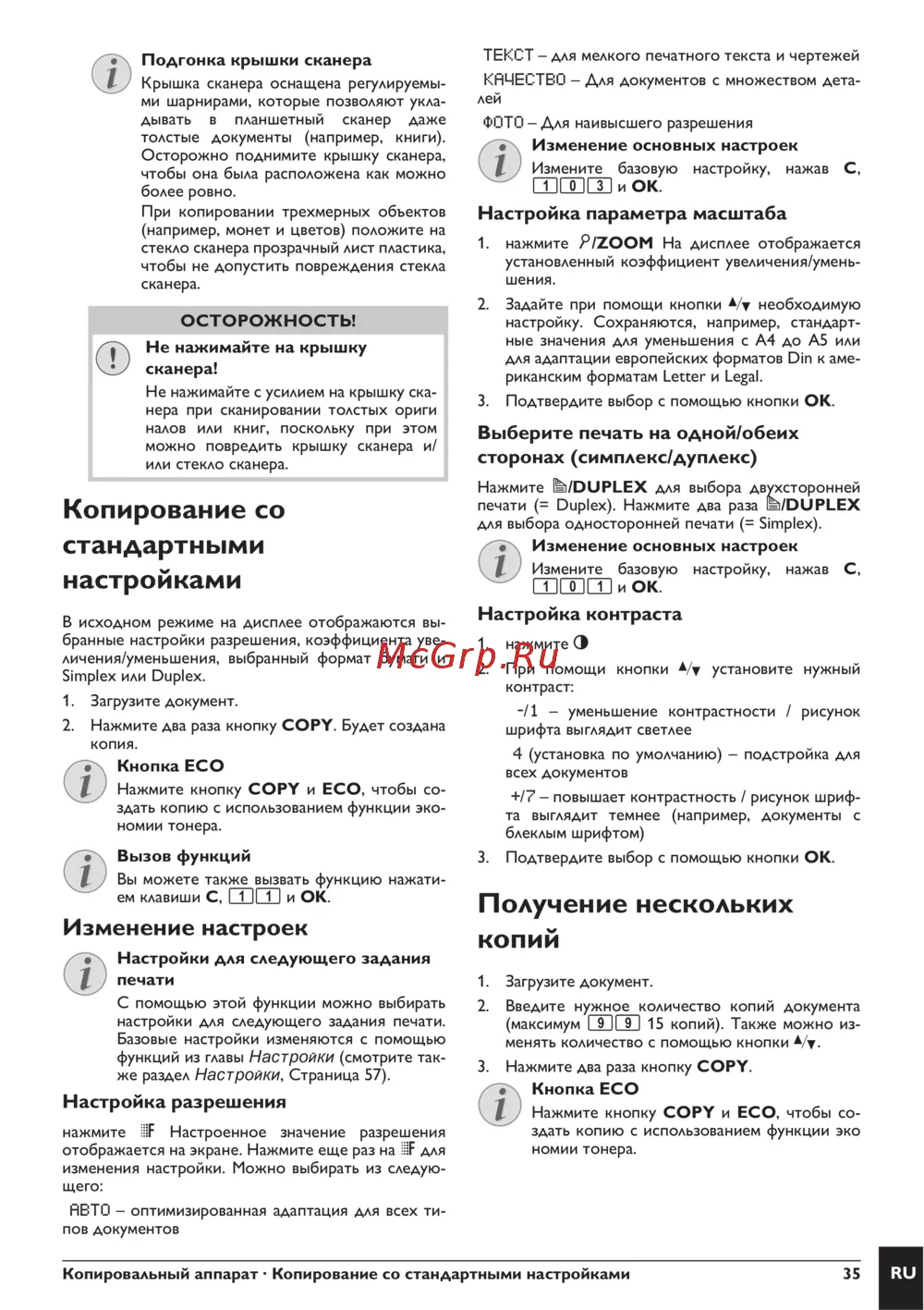 Копировальный аппарат · Копирование со стандартными настройками 35