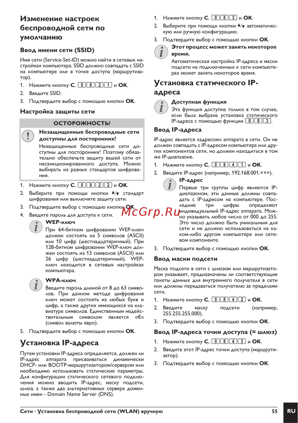 Сети · Установка беспроводной сети (WLAN) вручную 55