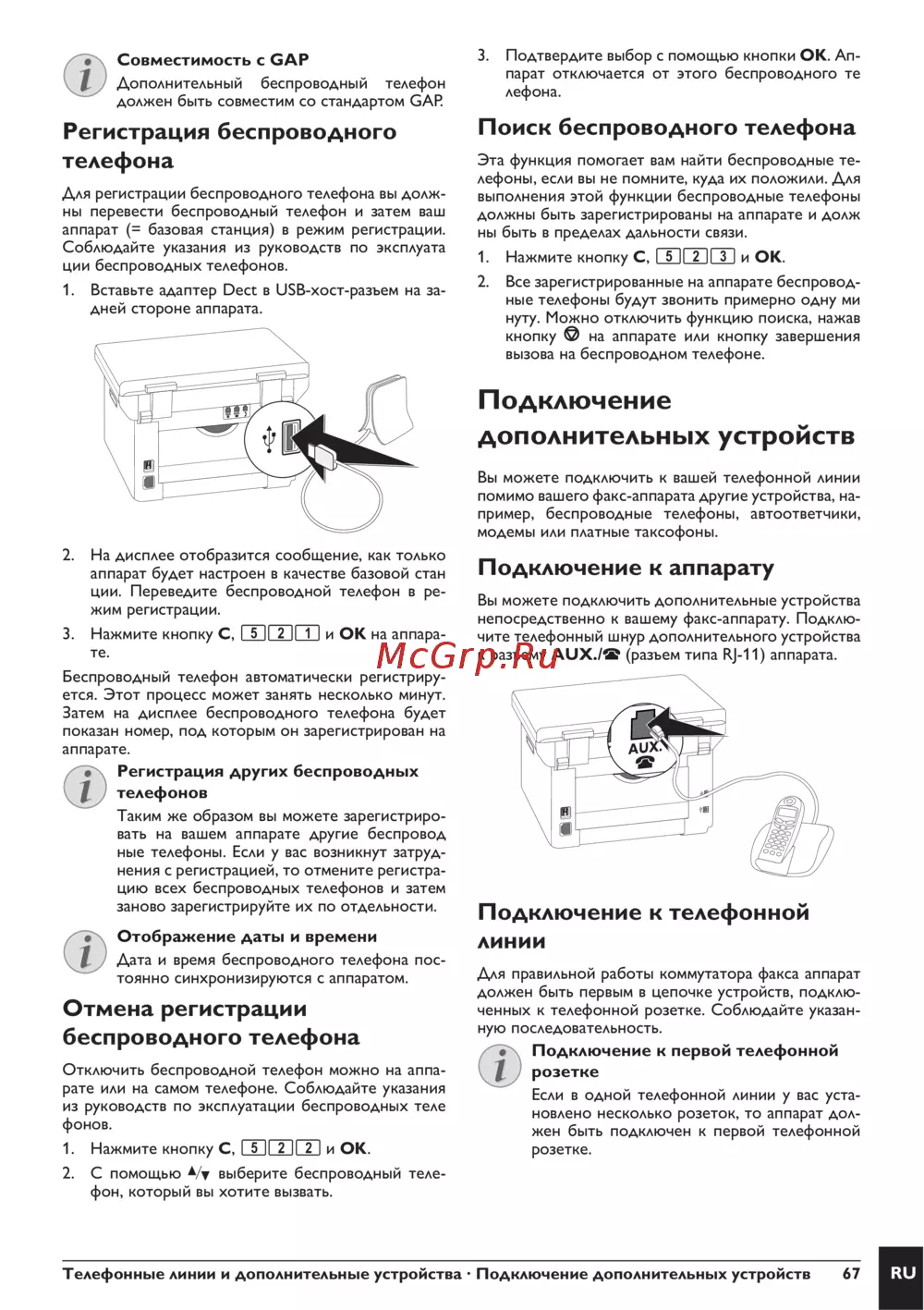 Телефонные линии и дополнительные устройства · Подключение дополнительных устройств 67