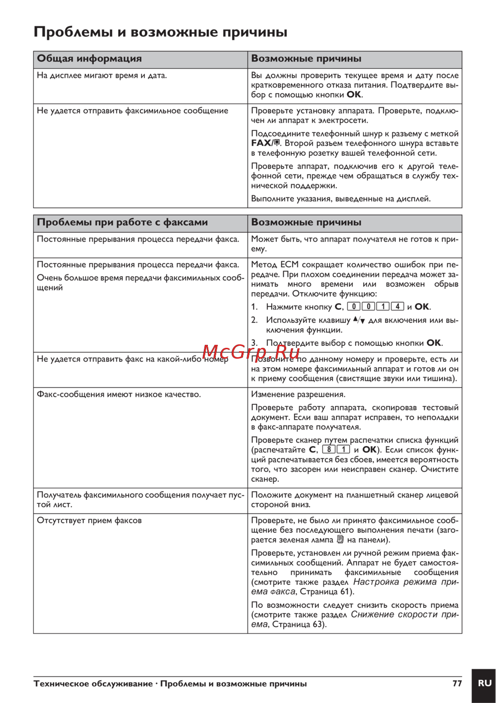 - Проблемы при работе с факсами возможные причины p.77