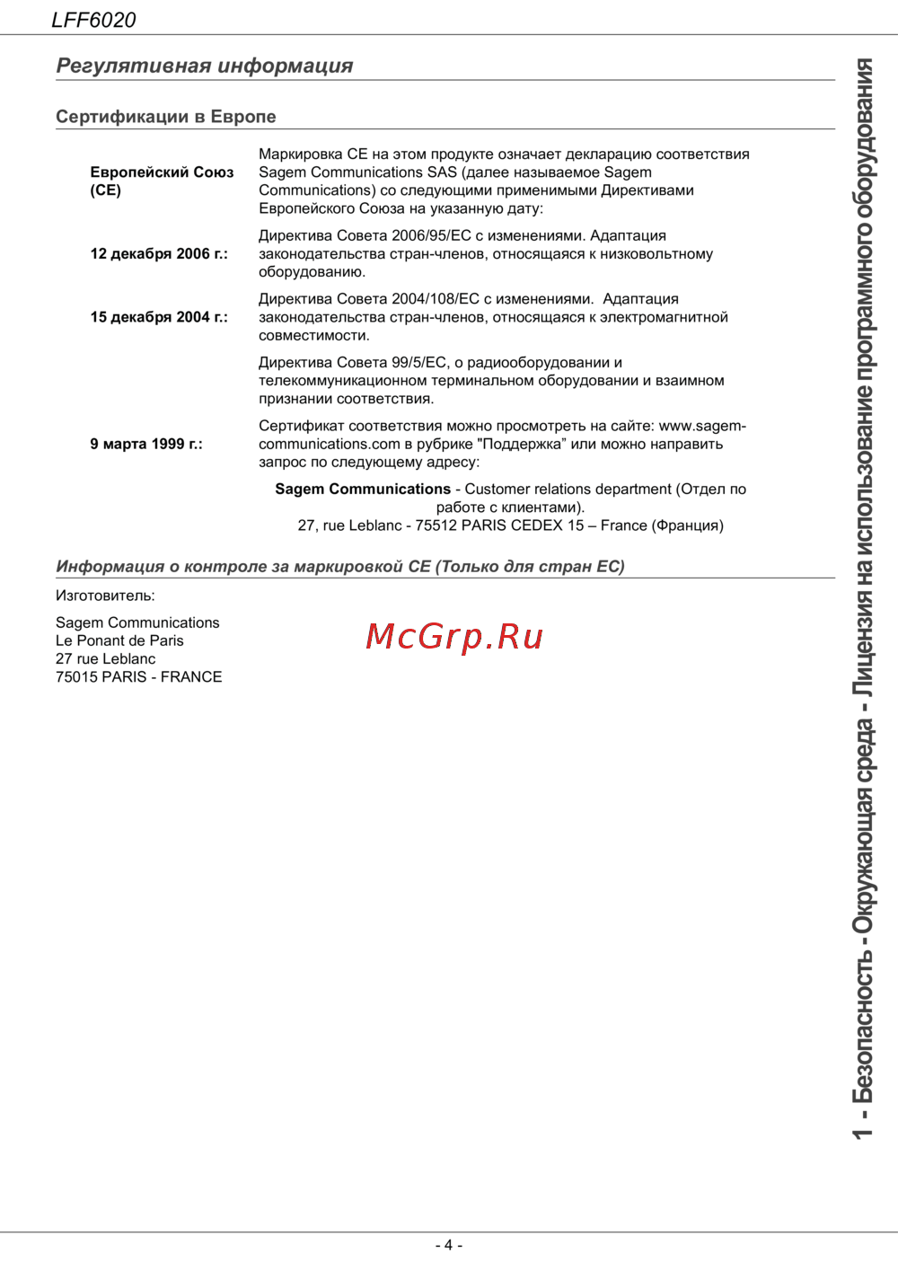 Сертификат соответствия можно просмотреть на сайте: www.sagem-