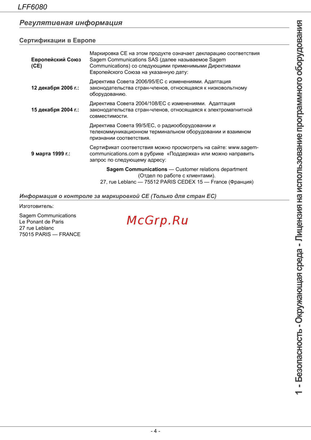 Сертификат соответствия можно просмотреть на сайте: www.sagem-