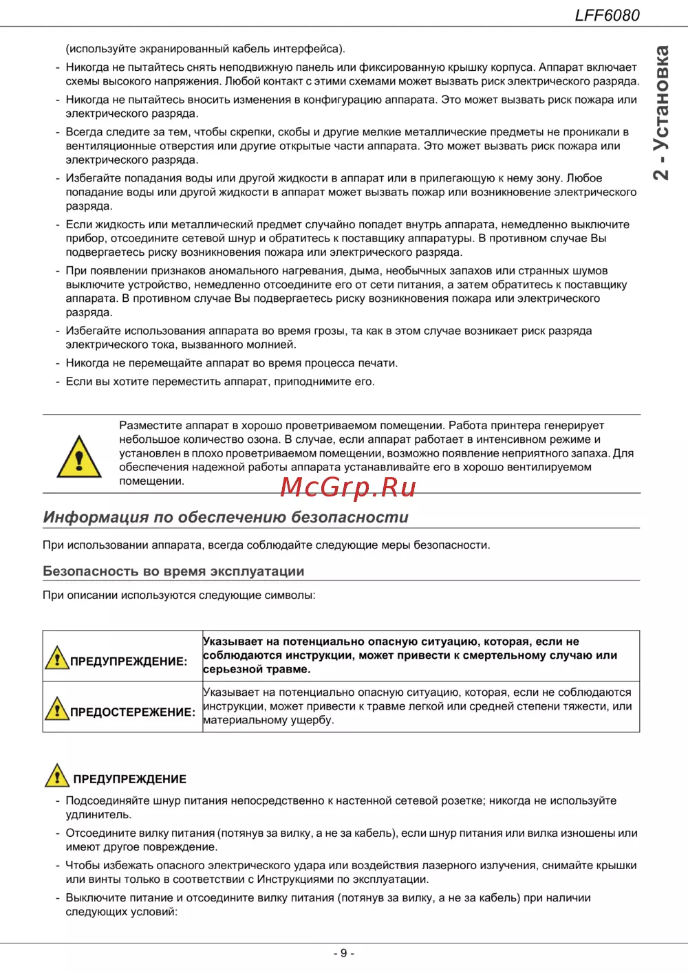 - Никогда не пытайтесь вносить изменения в конфигурацию аппарата. Это может вызвать риск пожара или