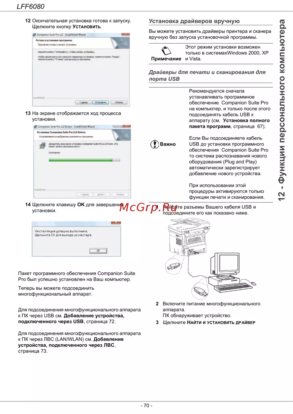 Подробное руководство по установке и подключению многофункционального устройства к компьютеру через USB и ЛВС. Узнайте, как установить драйверы и программное обеспечение.