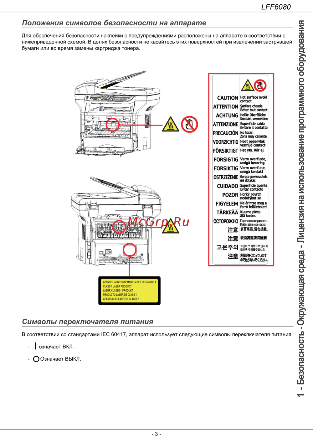 - Положения символов безопасности на аппарате p.9