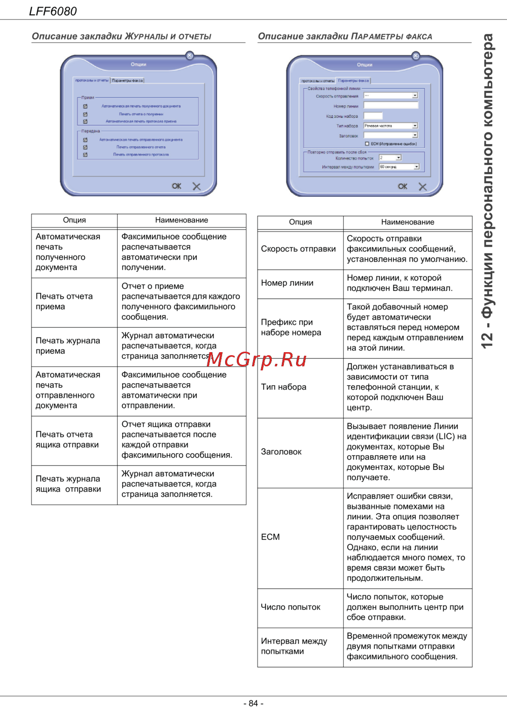 Описание закладки ЖУРНАЛЫ И ОТчЕТЫ Описание закладки ПАРАМЕТРЫ ФАКСА