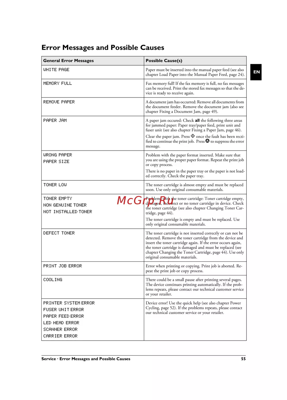 Service · Error Messages and Possible Causes 55