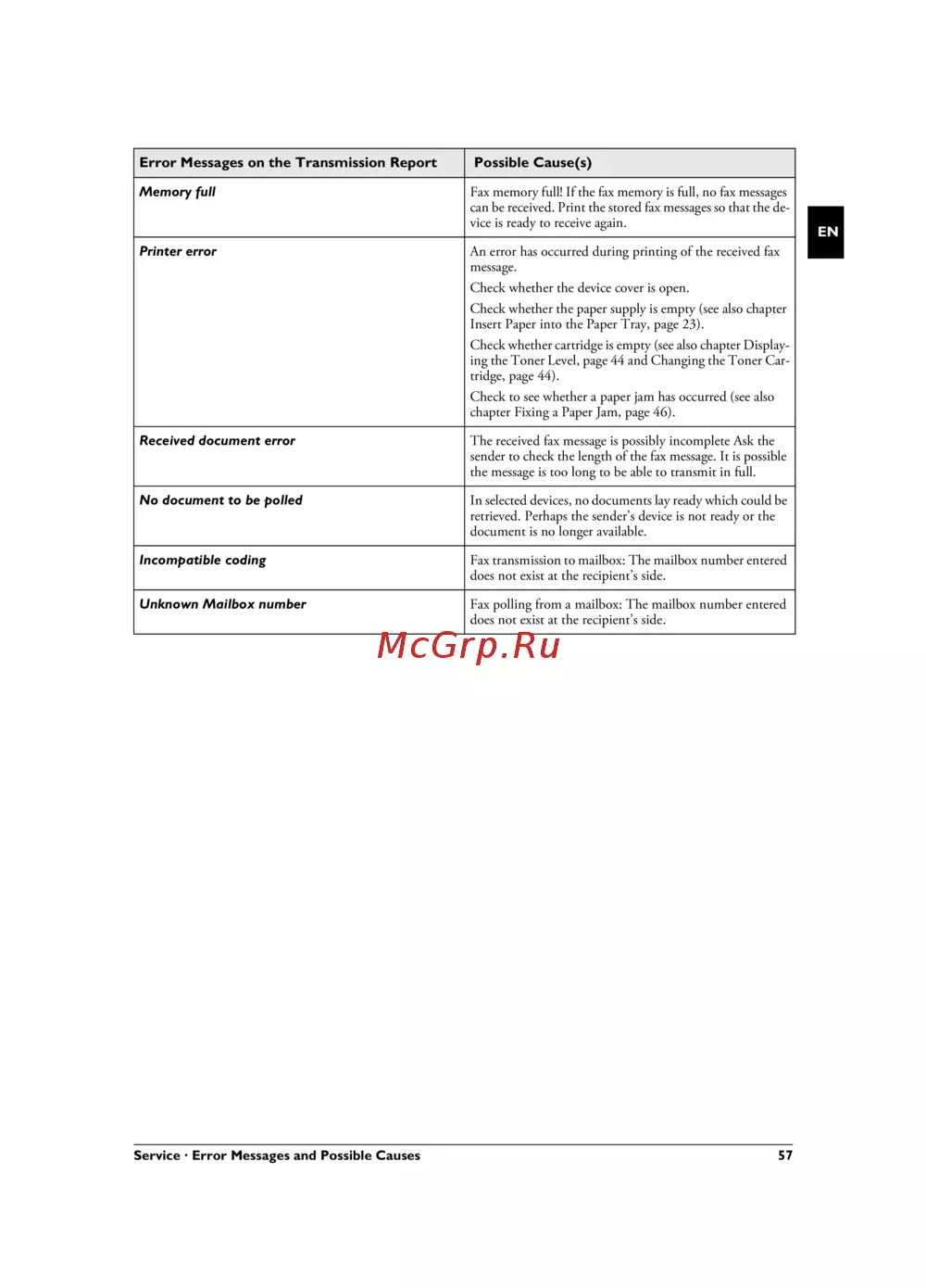 Philips Laserfax 5135 [57/68] Error messages on the transmission report possible cause s
