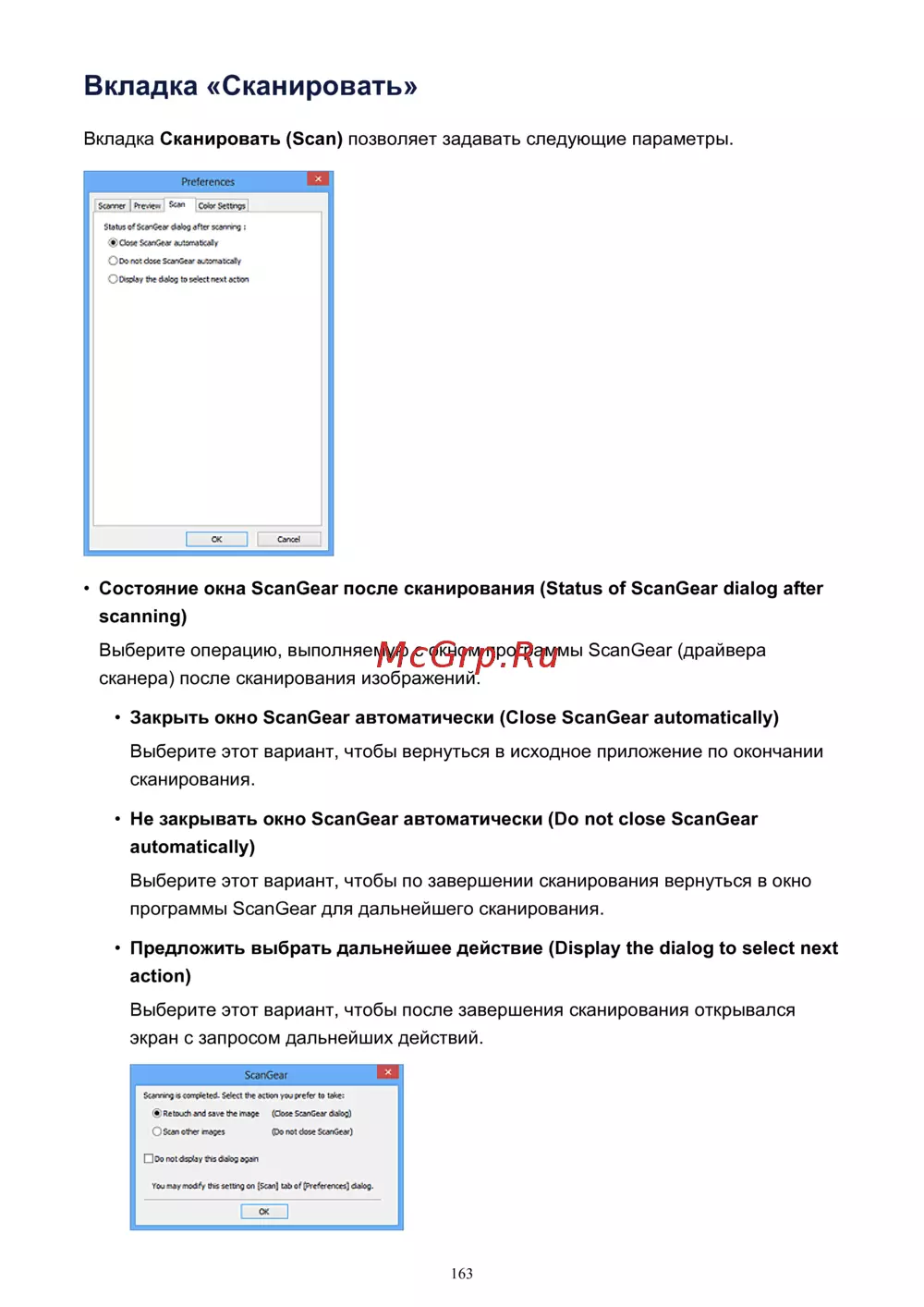 Узнайте, как настроить параметры окна ScanGear после сканирования. Выберите автоматическое закрытие, оставление открытым или запрос дальнейших действий.