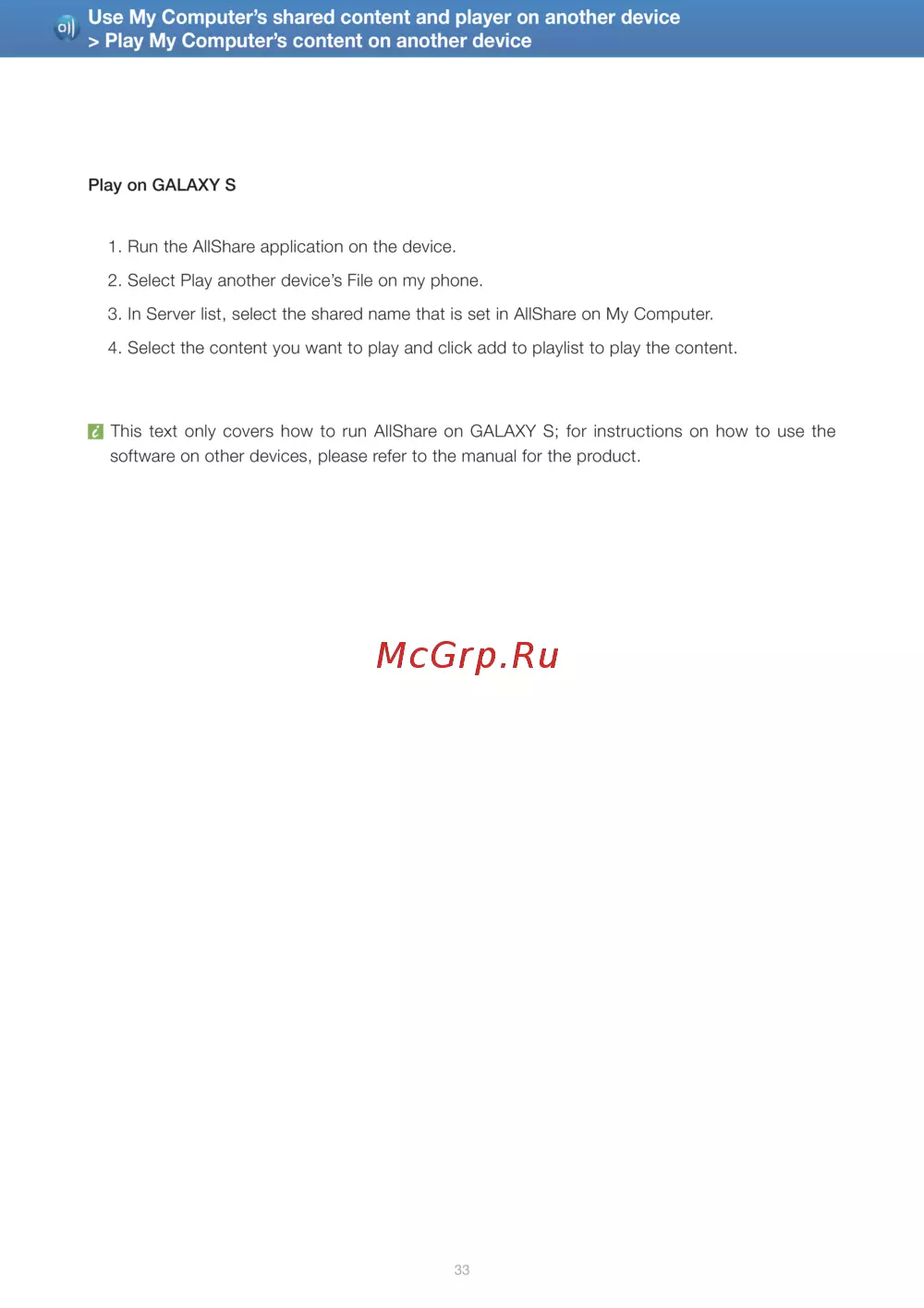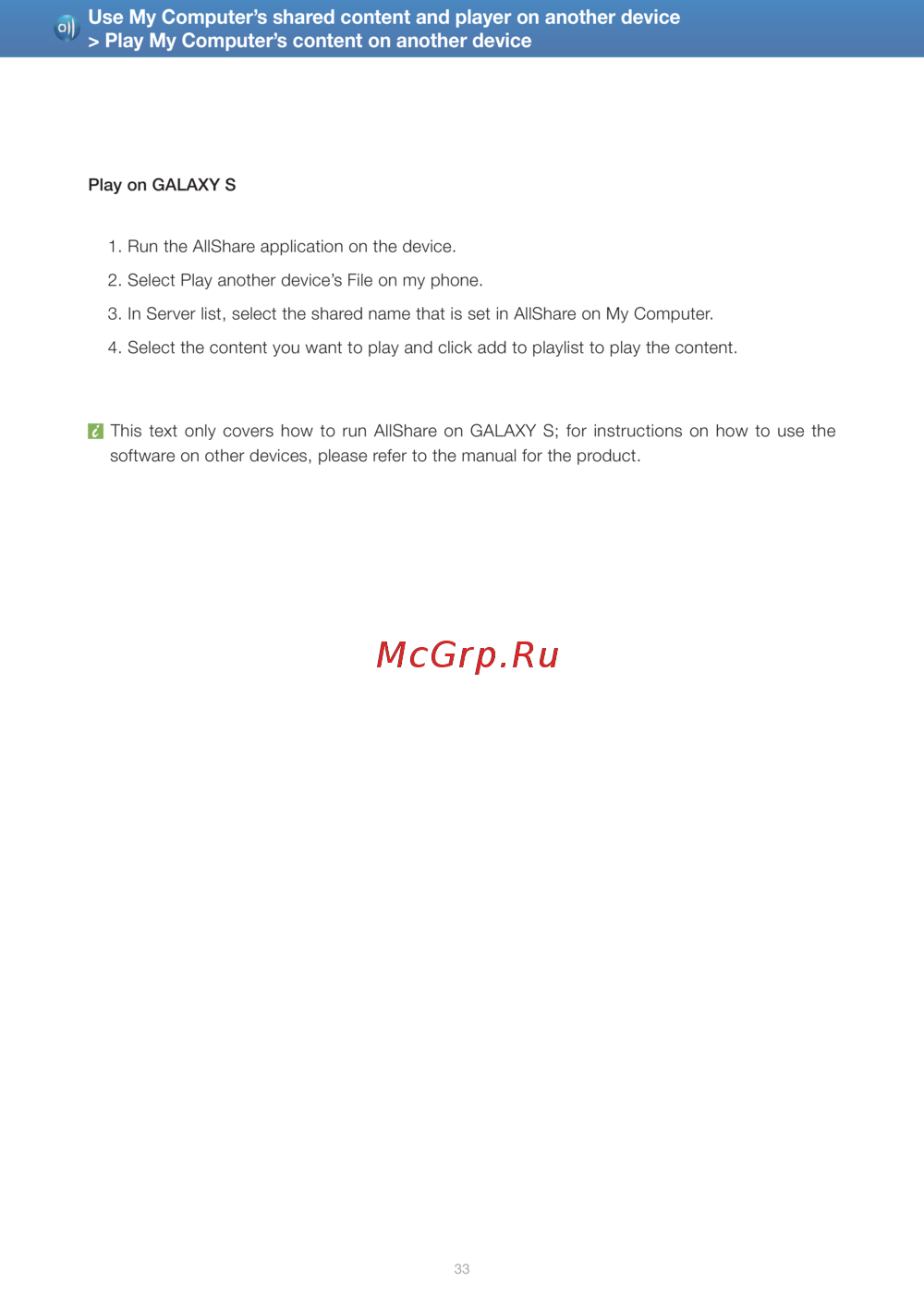 This text only covers how to run AllShare on GALAXY S; for instructions on how to use the
