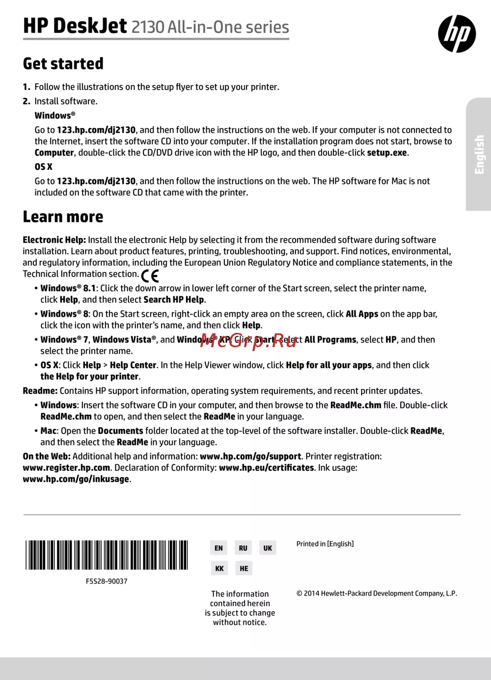 HP DeskJet 2130 Руководство по началу работы онлайн