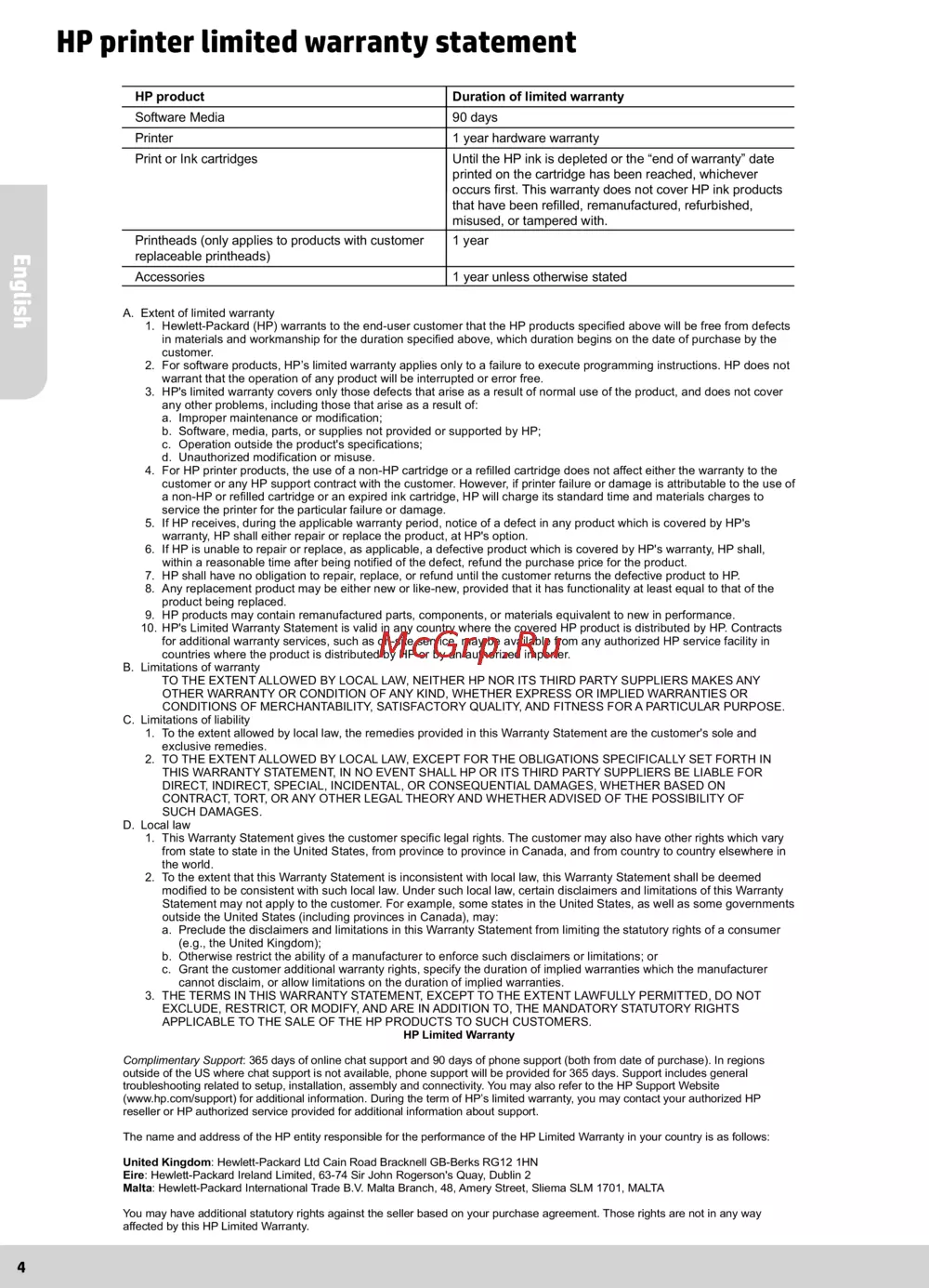 - Hp printer limited warranty statement p.4
