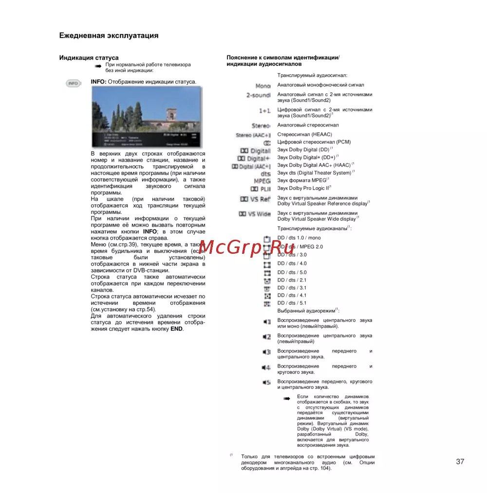 Узнайте о ежедневной эксплуатации телевизора, индикации статуса, отображении информации о каналах и аудиосигналах. Получите полезные советы по настройке.