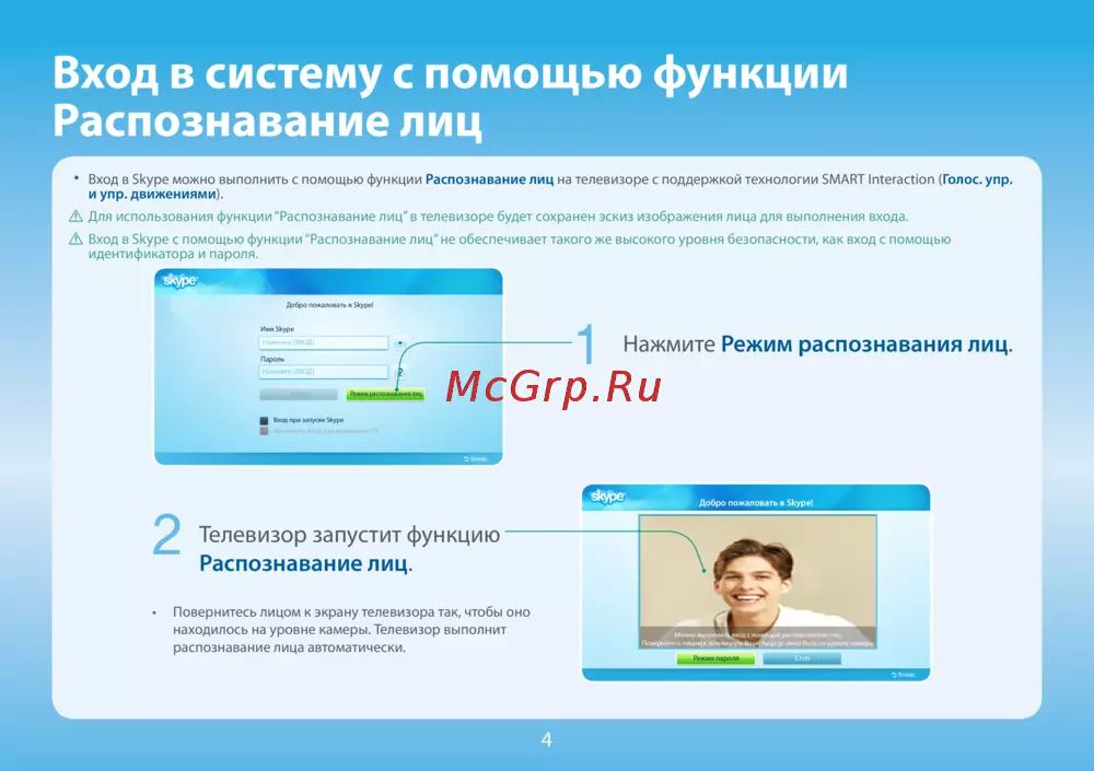 Вход в Skype можно выполнить с помощью функции Распознавание лиц на телевизоре с поддержкой технологии SMART Interaction (Голос. упр.