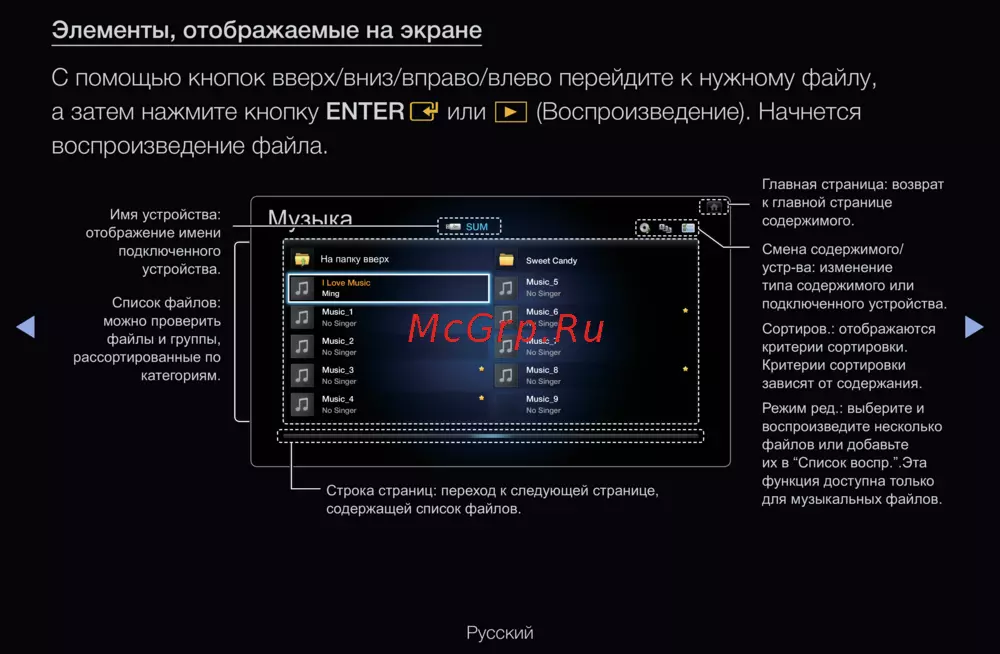 - С помощью кнопок вверх вниз вправо влево перейдите к нужному файлу а затем нажмите кнопку enter e или воспроизведение начнется воспроизведение файла p.233