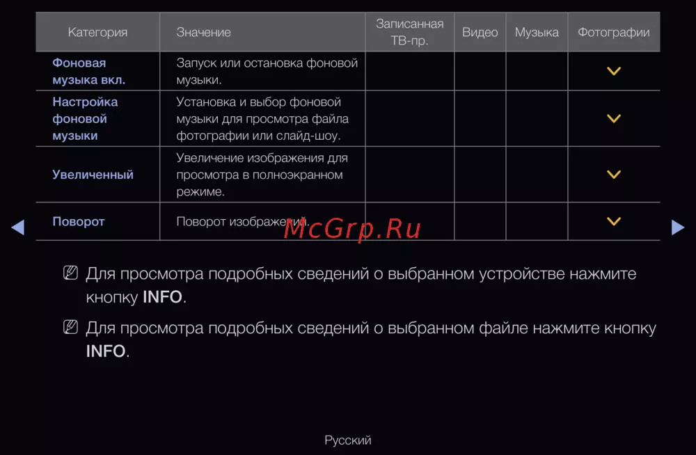 - Для просмотра подробных сведений о выбранном файле нажмите кнопку info p.265