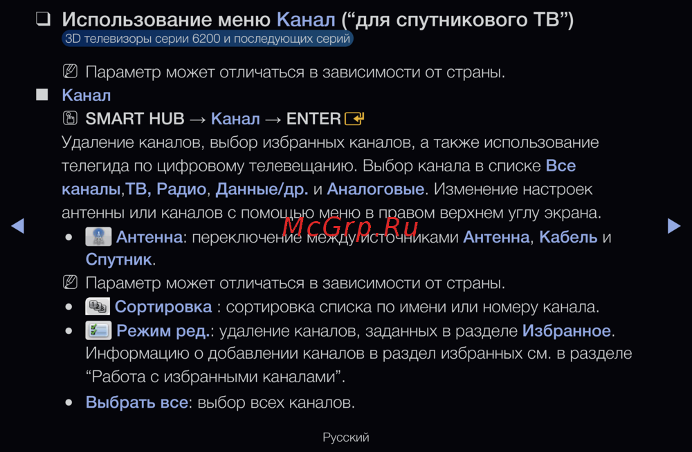 антенны или каналов с помощью меню в правом верхнем углу экрана.