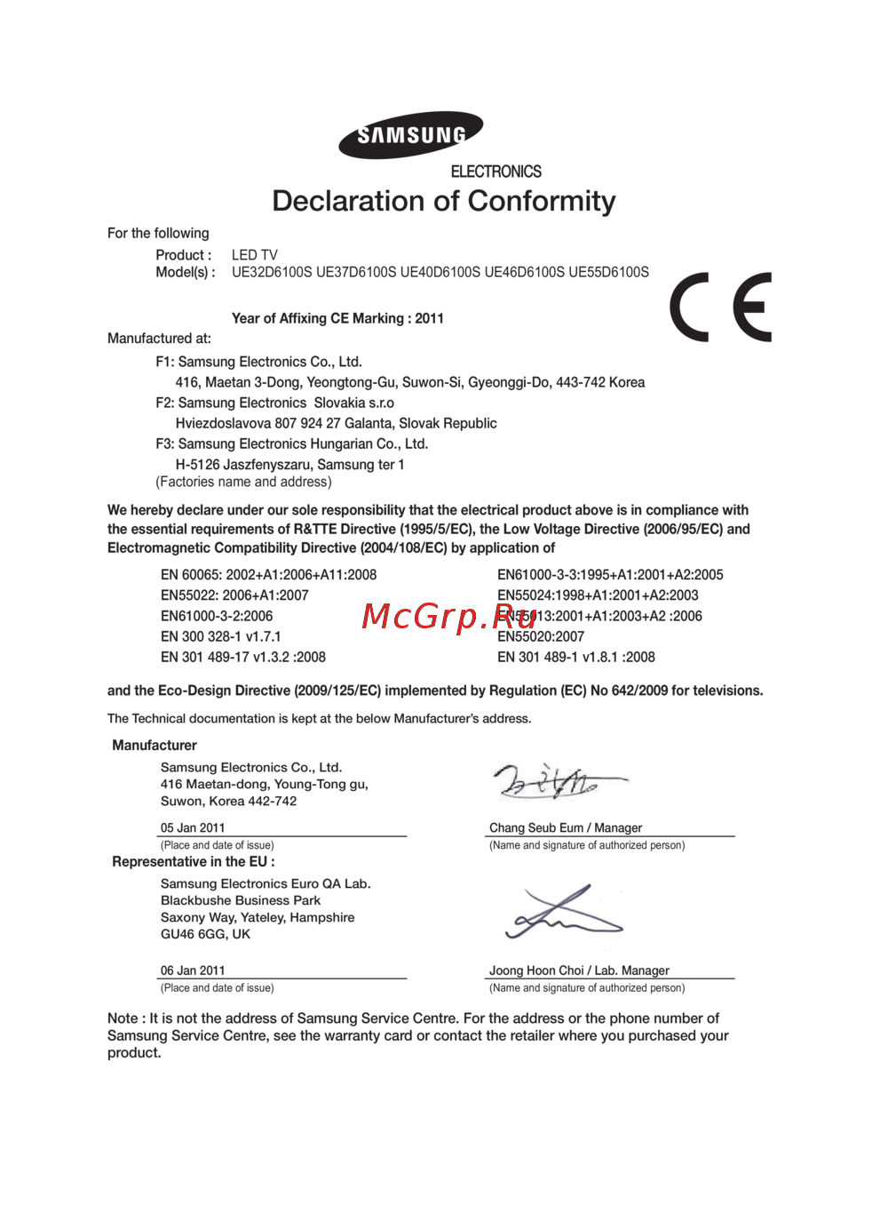 Samsung UE-32 D6100SW — declaration of Conformity for LED Televisions and Compliance Standards [22/84]