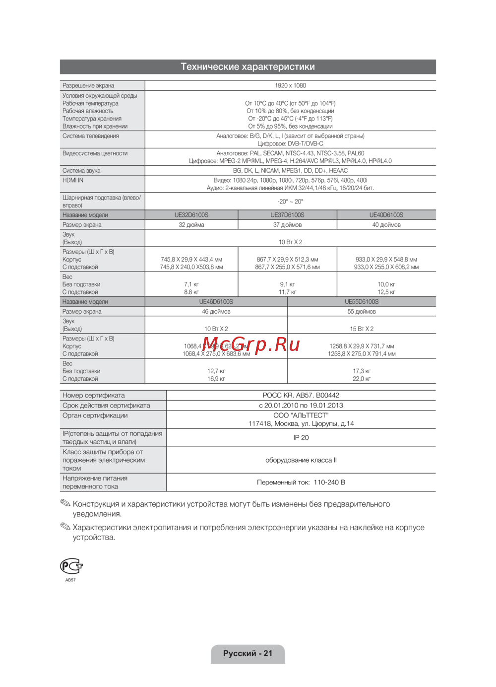 Samsung UE-32 D6100SW — технические характеристики телевизоров с различными размерами экранов [43/84]