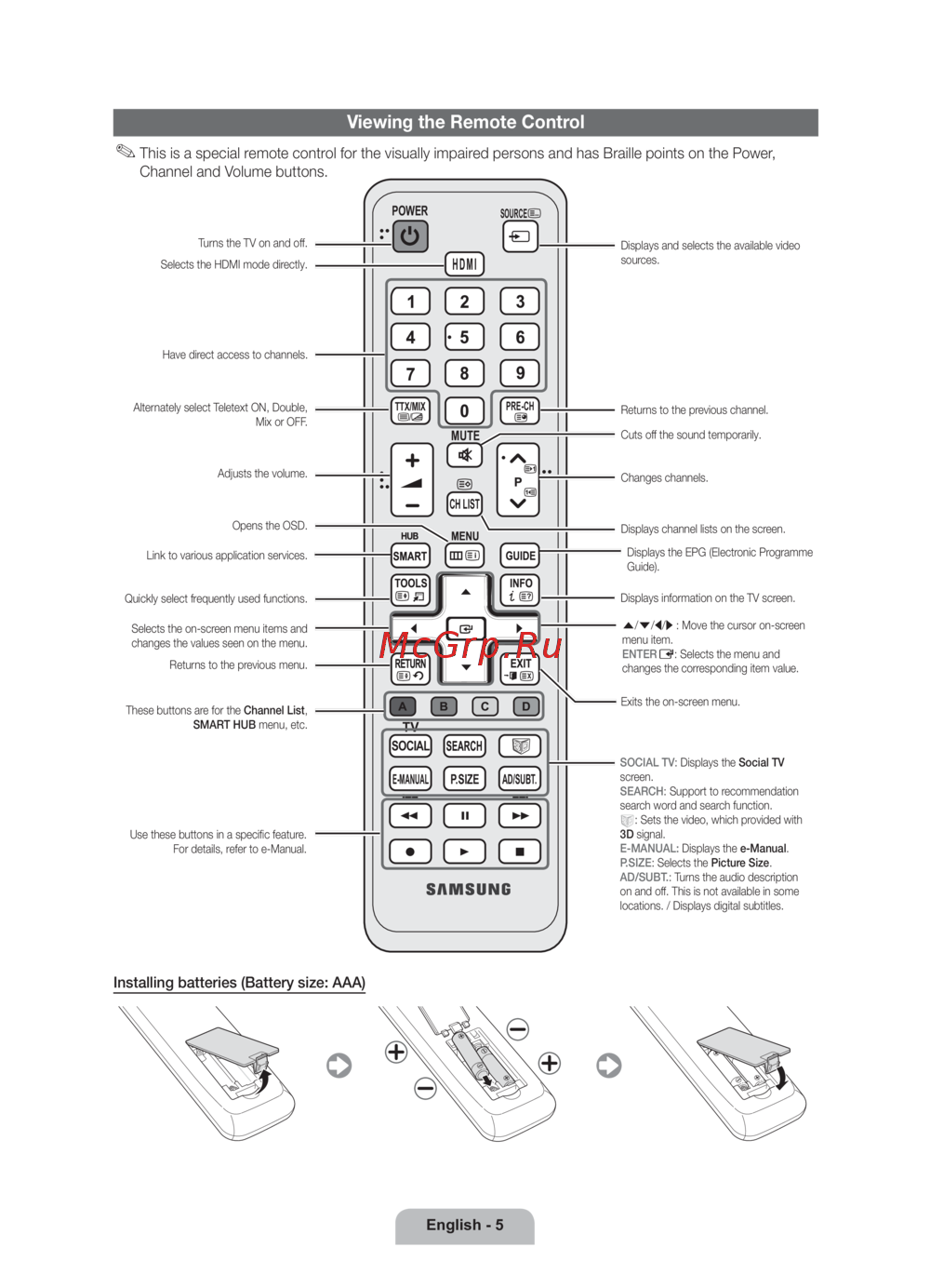 - This is a special remote control for the visually impaired persons and has braille points on the power channel and volume buttons p.5