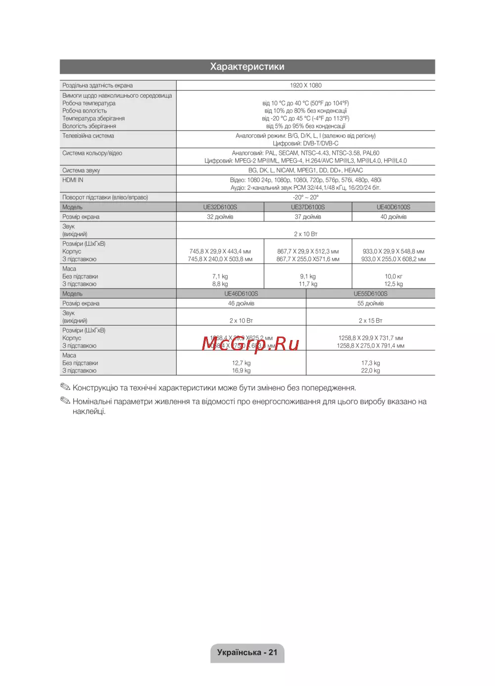 Samsung UE-32 D6100SW — технічні характеристики телевізорів з роздільною здатністю 1920x1080 [63/84]