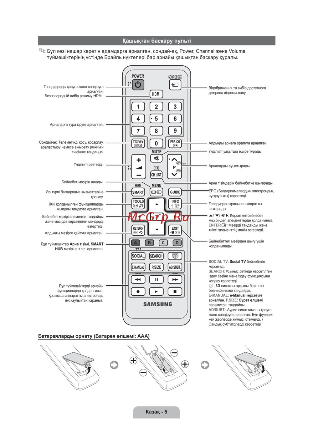 - Бұл көзі нашар көретін адамдарға арналған сондай ақ power channel және volume түймешіктерінің үстінде брайль нүктелері бар арнайы қашықтан басқару құралы p.67