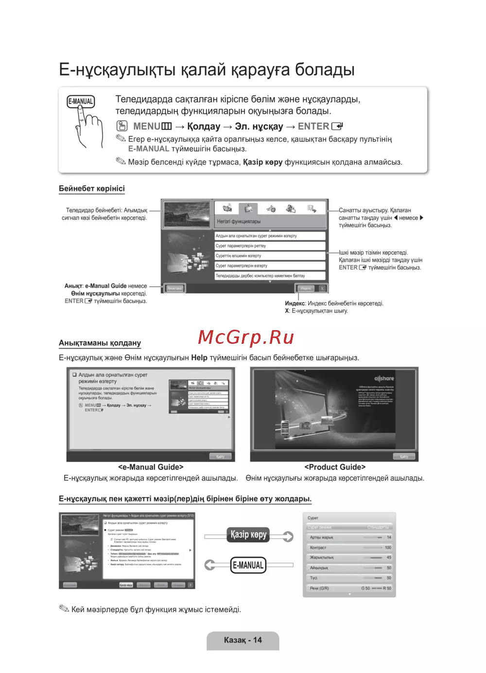 Е-нұсқаулықты қалай қарауға болатынын біліңіз. Теледидардың негізгі функцияларын, сурет режимдерін және параметрлерін реттеу жолдарын қарастырыңыз.