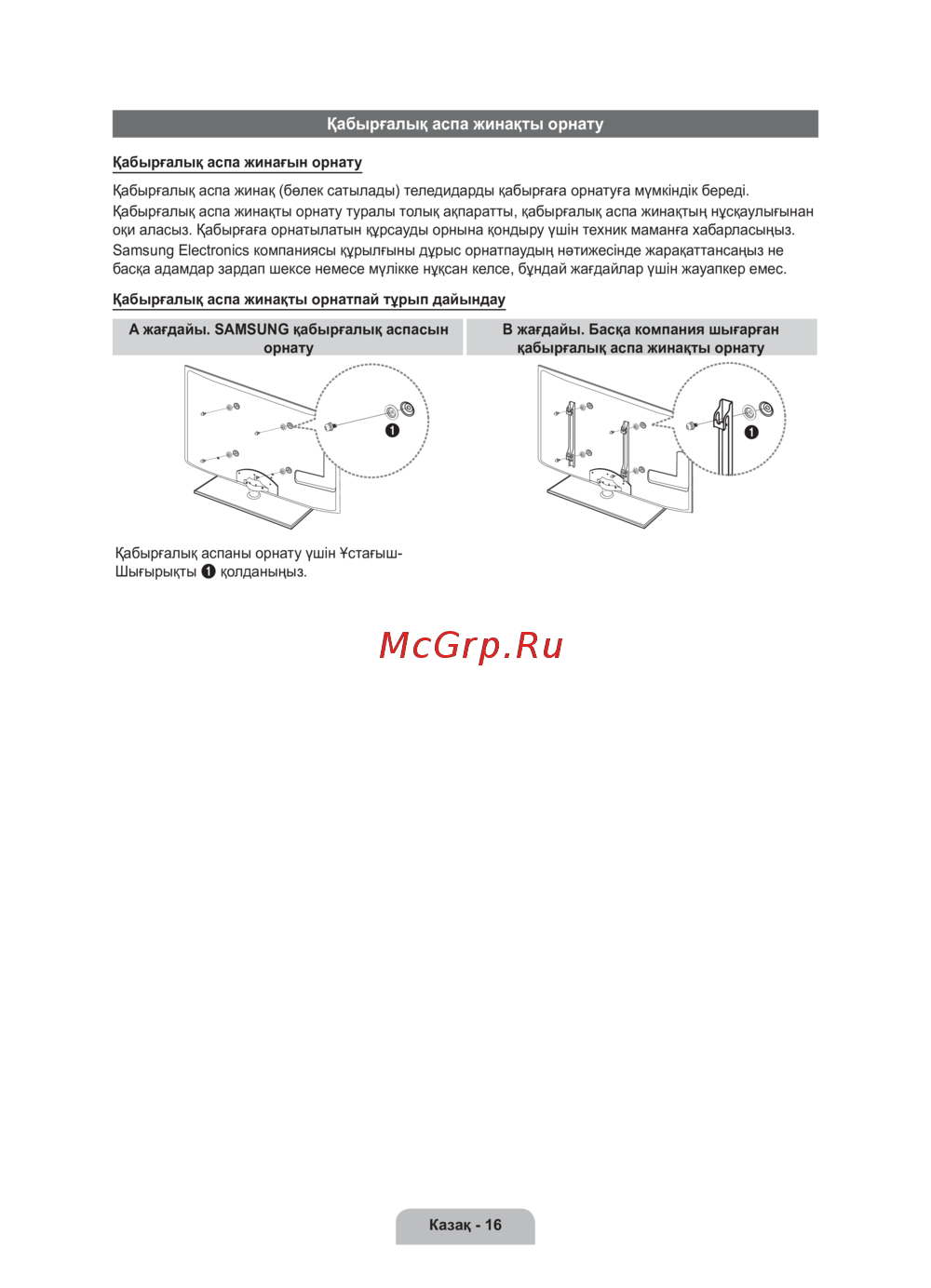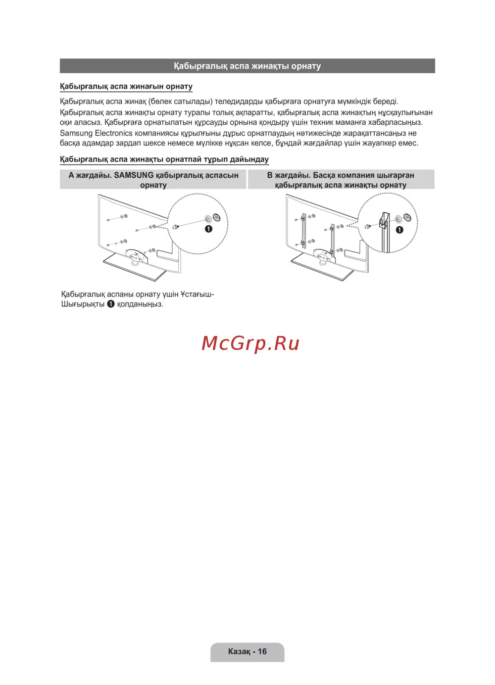 оқи аласыз. Қабырғаға орнатылатын құрсауды орнына қондыру үшін техник маманға хабарласыңыз.