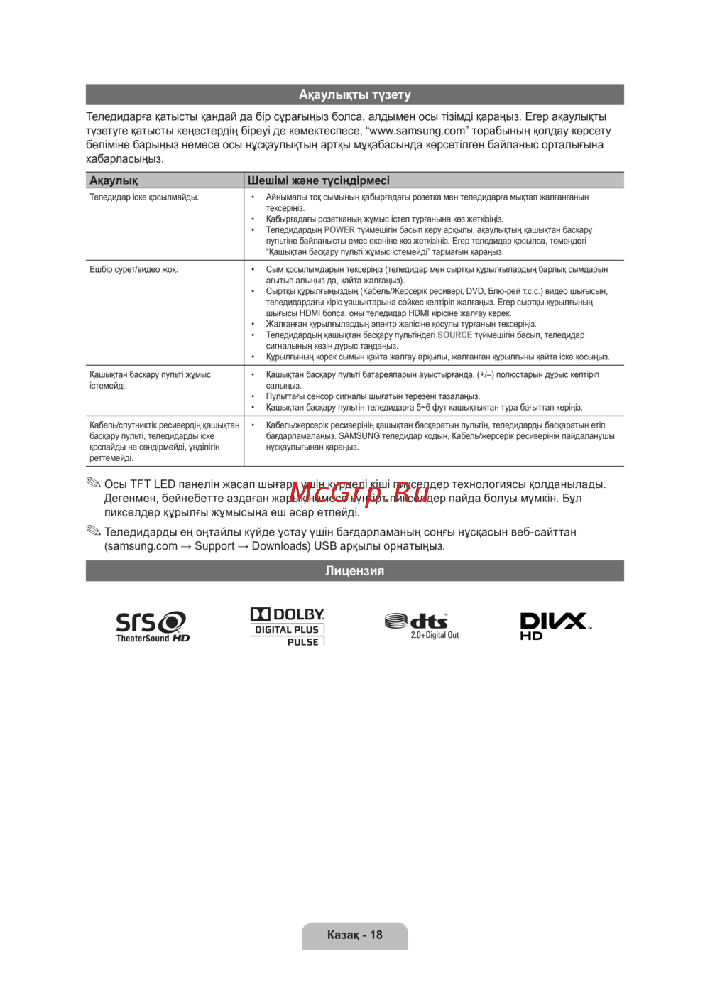 - Теледидарға қатысты қандай да бір сұрағыңыз болса алдымен осы тізімді қараңыз егер ақаулықты түзетуге қатысты кеңестердің біреуі де көмектеспесе www samsung com торабының қолдау көрсету бөліміне барыңыз немесе осы нұсқаулықтың артқы мұқабасында көрсетілген байланыс орталығына хабарласыңыз p.80