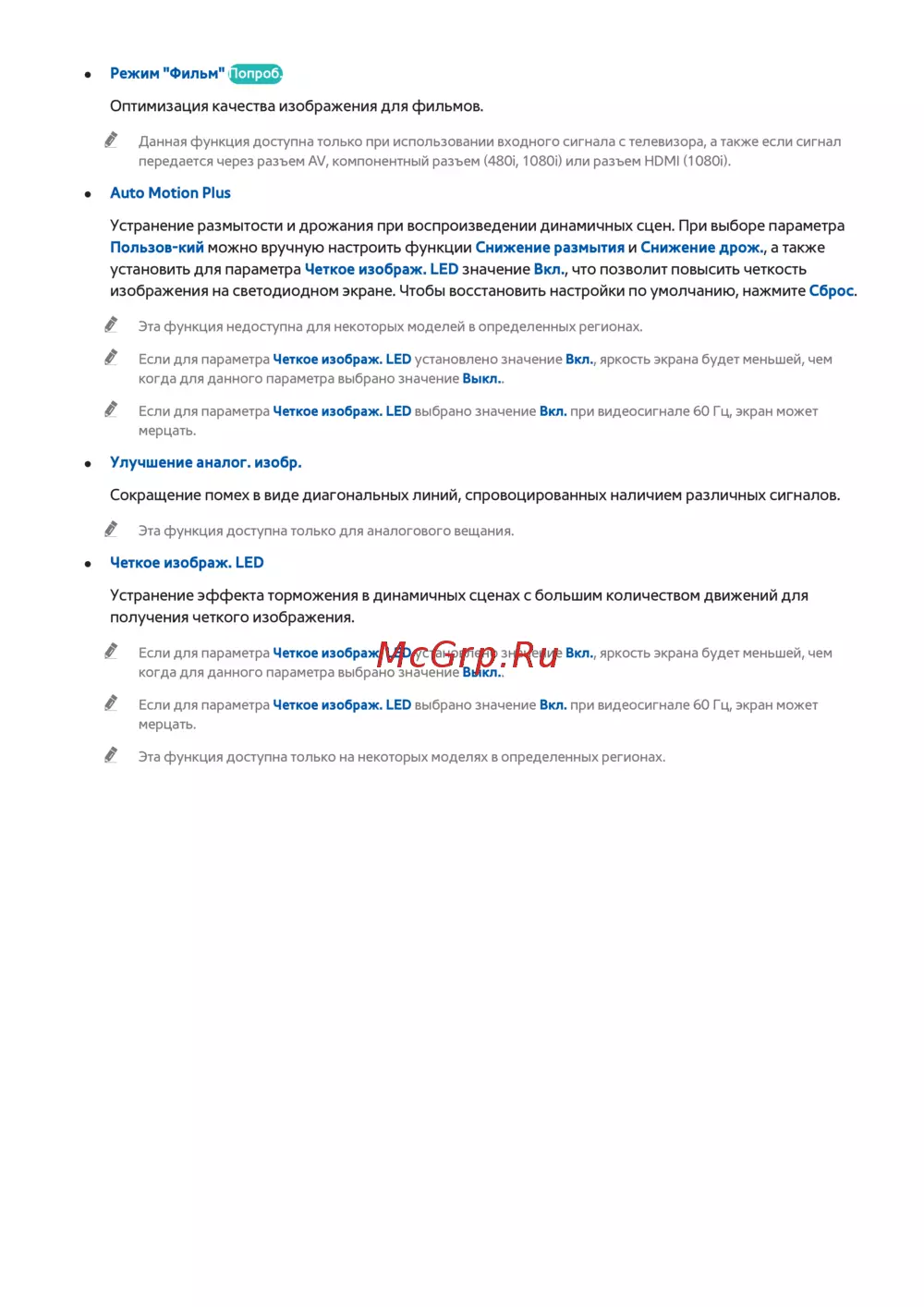 Если для параметра Четкое изображ. LED установлено значение Вкл., яркость экрана будет меньшей, чем