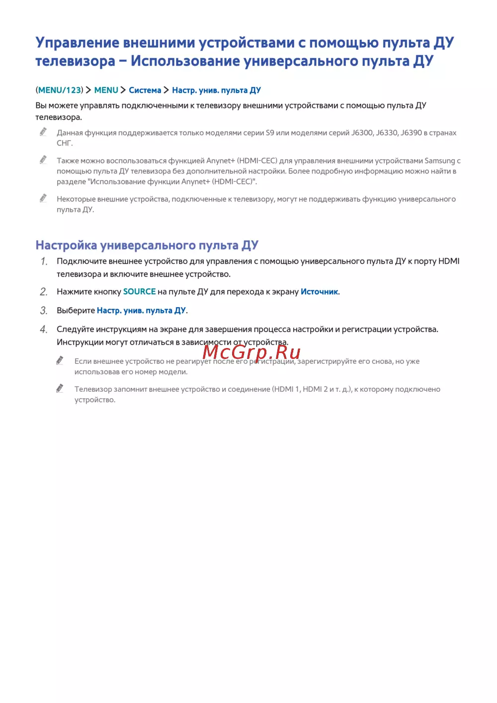 Также можно воспользоваться функцией Anynet+ (HDMI-CEC) для управления внешними устройствами Samsung с